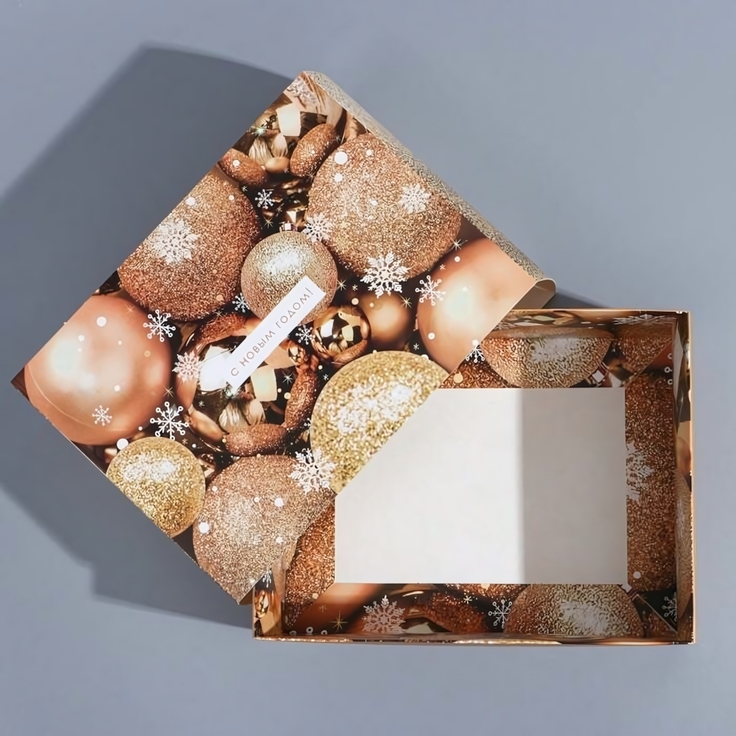 Подарочная коробка с дизайном «Новогодние шары» — идеальное решение для создания волшебства зимних праздников. Яркий золотисто-коричневый декор с блестящими акцентами превратит любой подарок в особенный сюрприз.