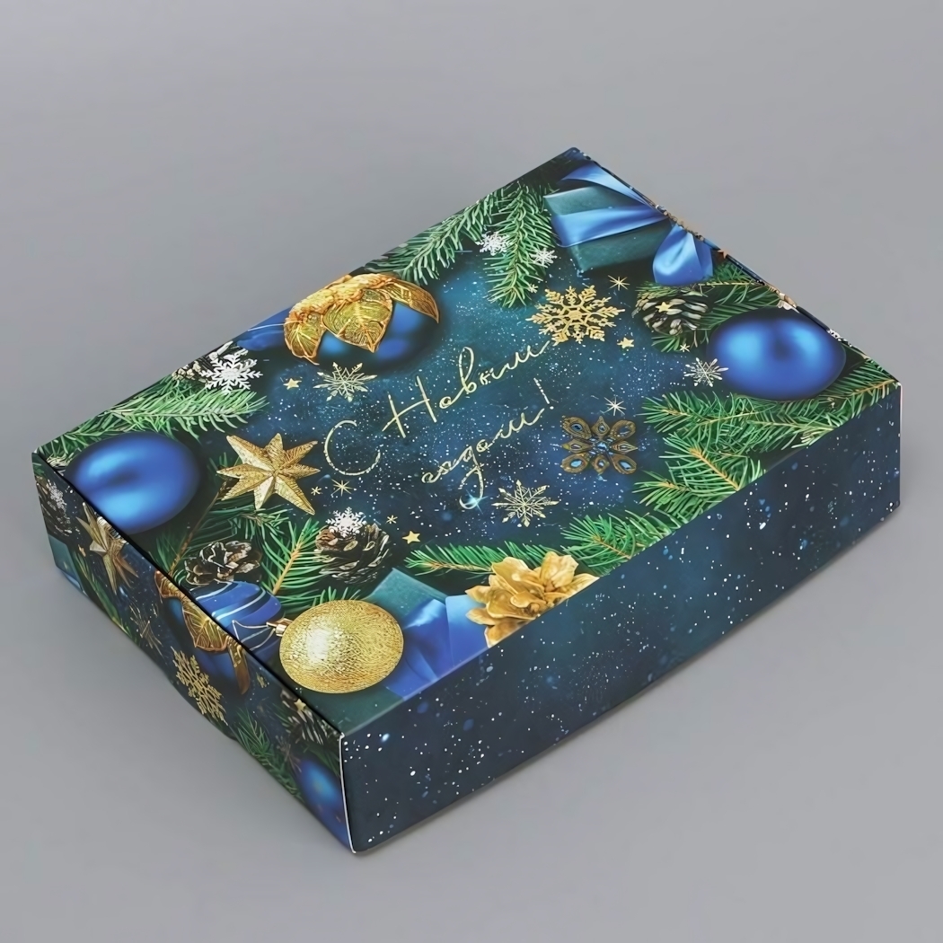 Коробка выполнена из качественного картона с полноцветной печатью. Темно-синий фон в сочетании с золотыми, зелеными и синими элементами создает элегантный новогодний образ. Надпись "С Новым годом!" добавляет изделию праздничного шарма.