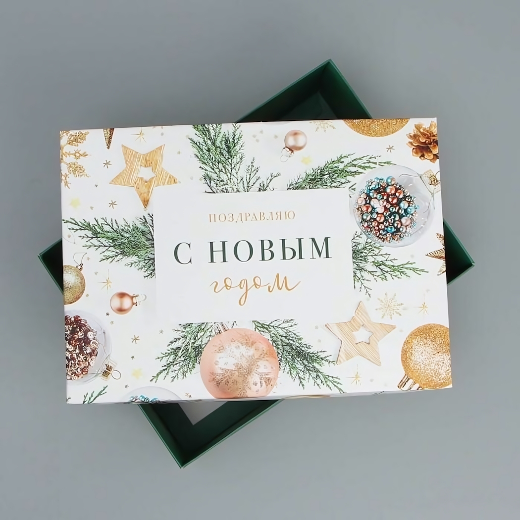 Праздничная коробка "С Новым годом" станет не просто упаковкой, а частью вашего подарка. Её изысканный дизайн с новогодними элементами и надписью в разных стилях шрифта создаст атмосферу праздника.