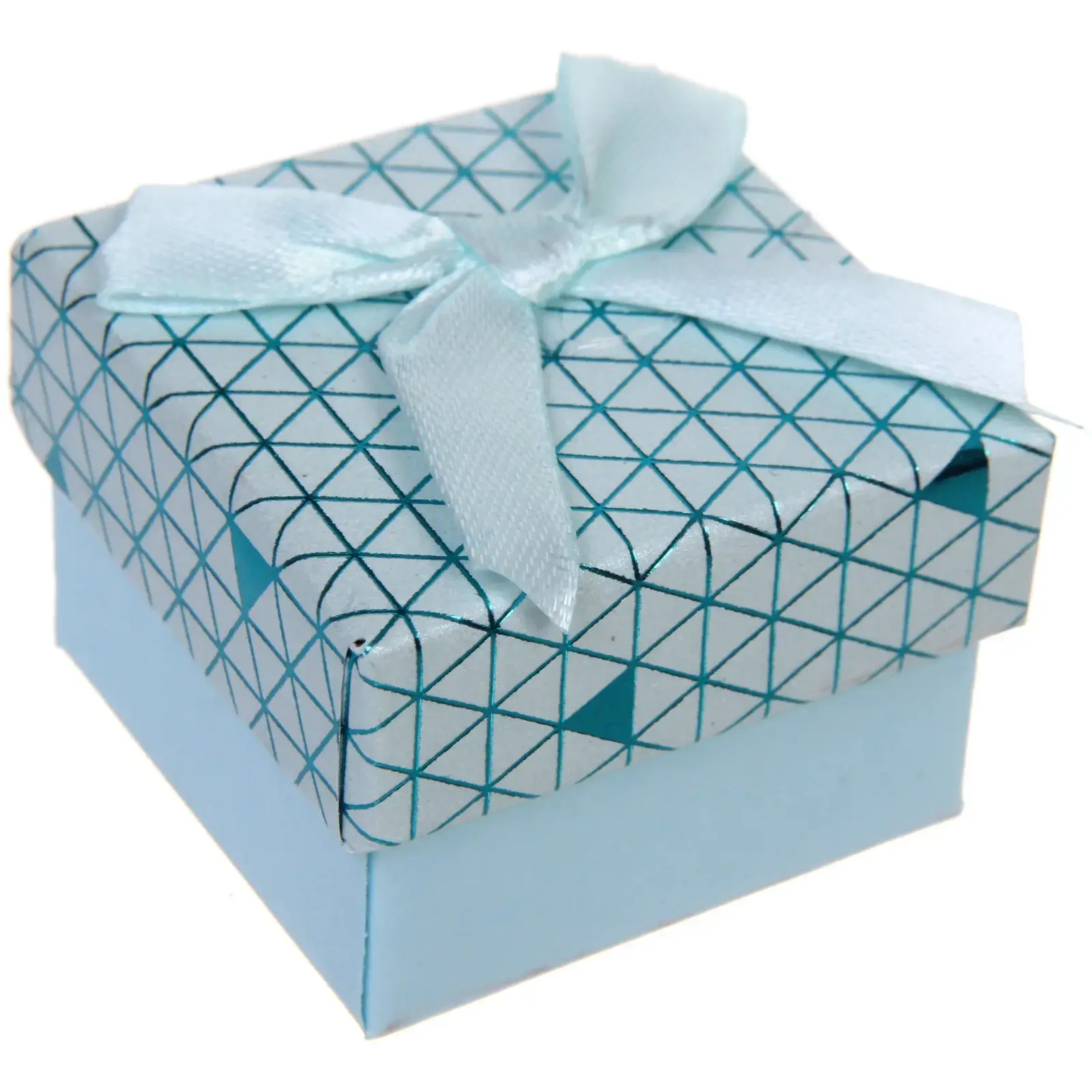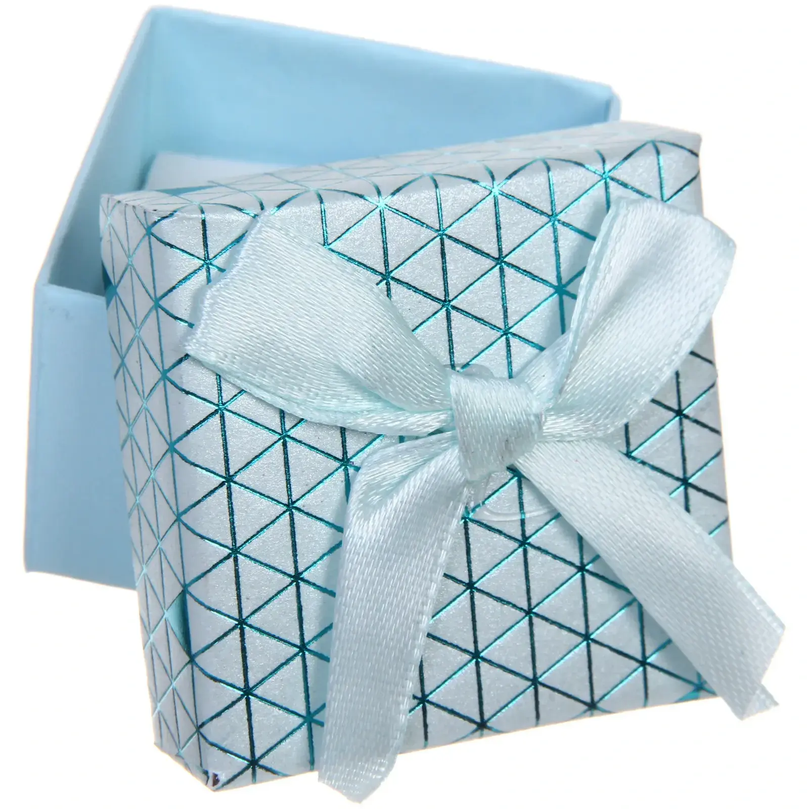 Коробка выполнена в голубом цвете с геометрическим узором, что делает ее универсальной для любого повода. Она станет не только упаковкой, но и частью подарка, создавая дополнительное впечатление. Размеры 5х5х3,5 см идеально подходят для небольших сюрпризов, а атласная лента добавляет изысканности.