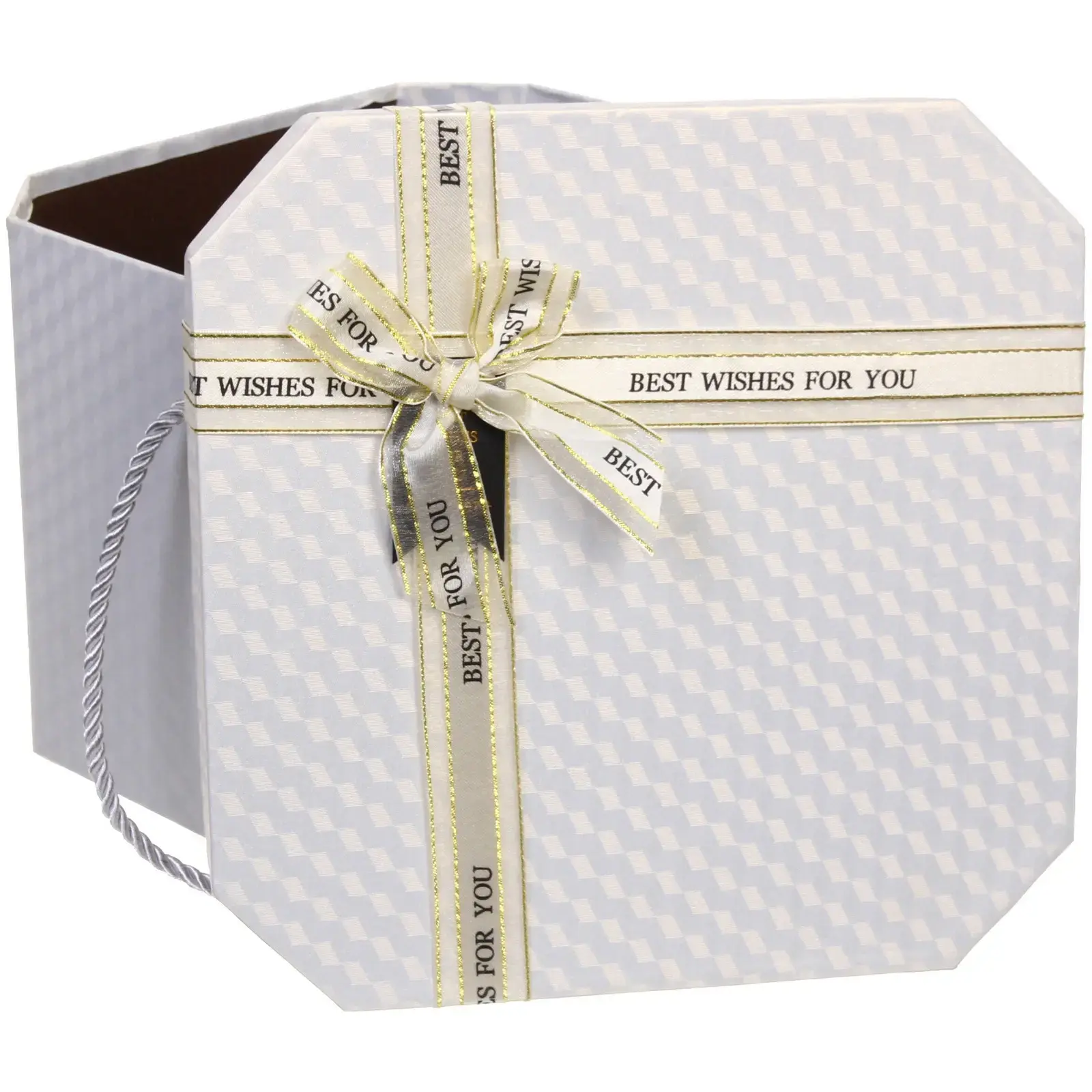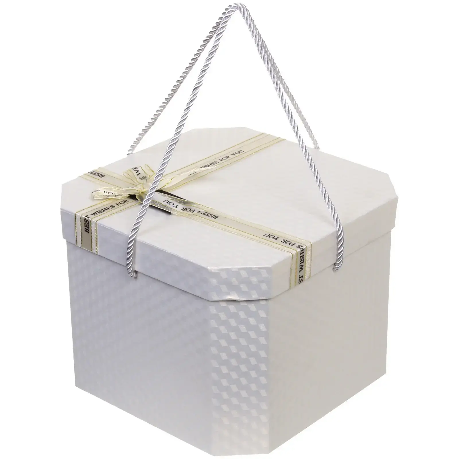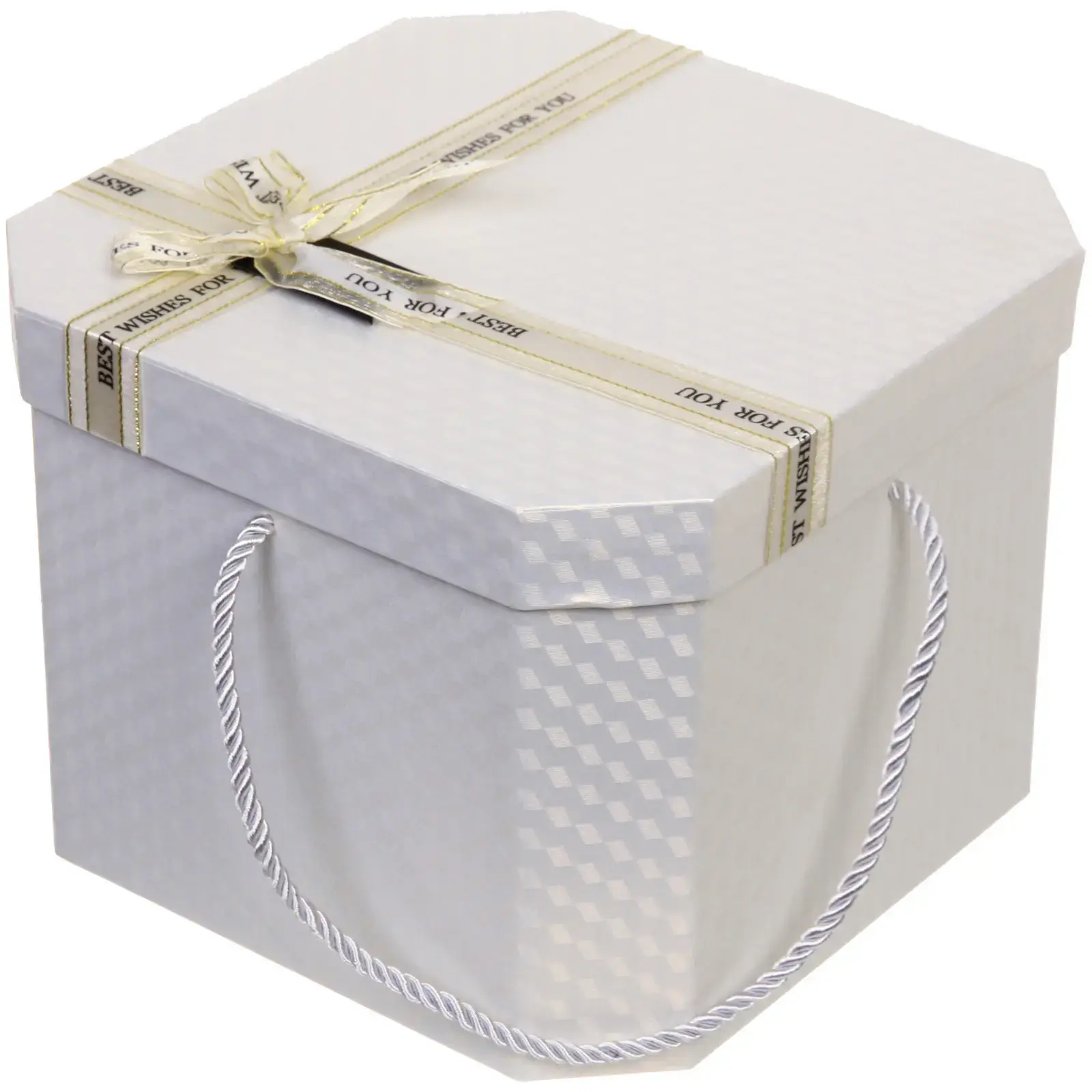 Эта стильная подарочная коробка станет идеальным решением для упаковки ваших подарков. Она выполнена в элегантном белом цвете и украшена золотистой лентой с надписью «BEST WISHES FOR YOU», что добавляет ей особый шарм и торжественность. Коробка имеет восьмигранную форму, что делает её не только красивой, но и практичной для хранения различных предметов.
