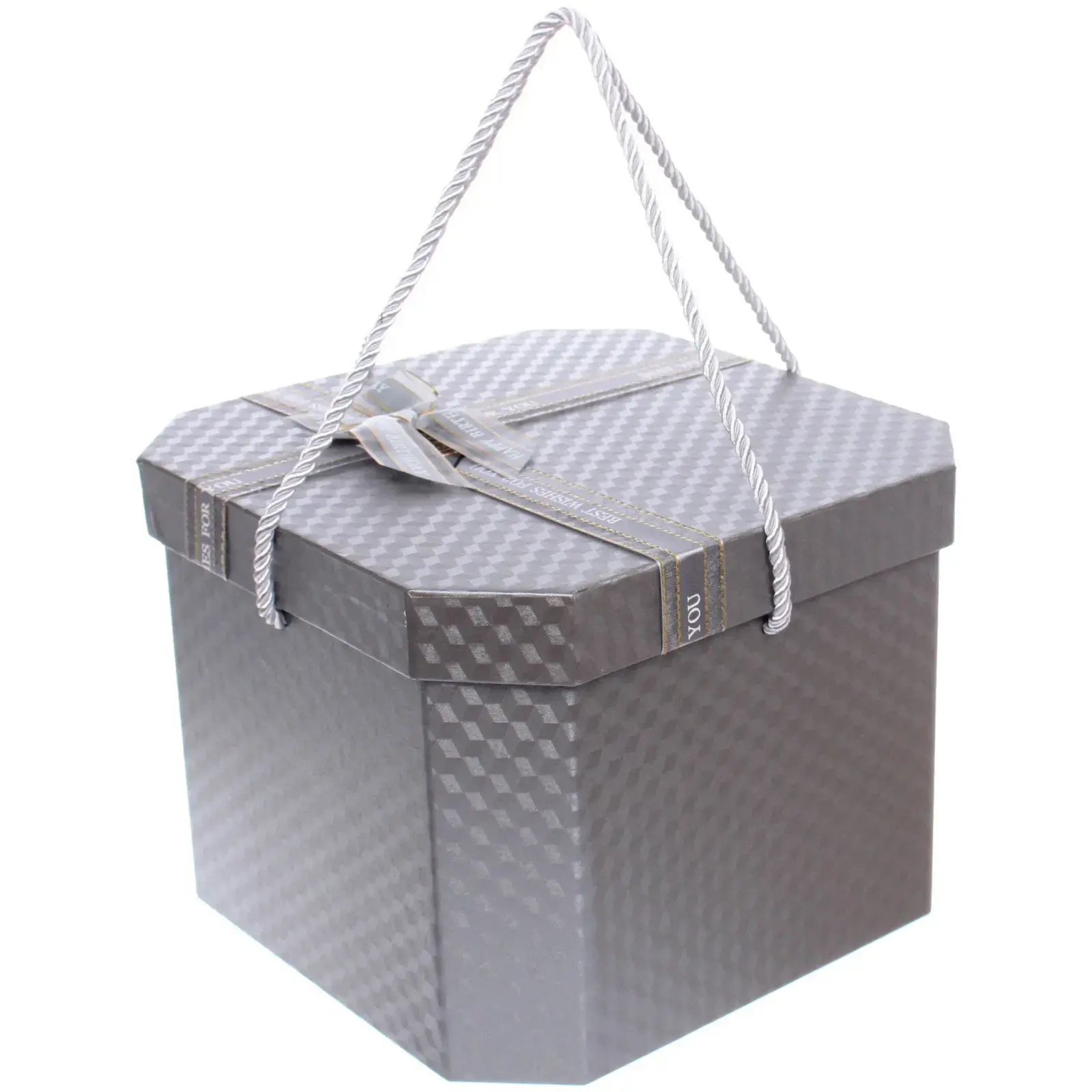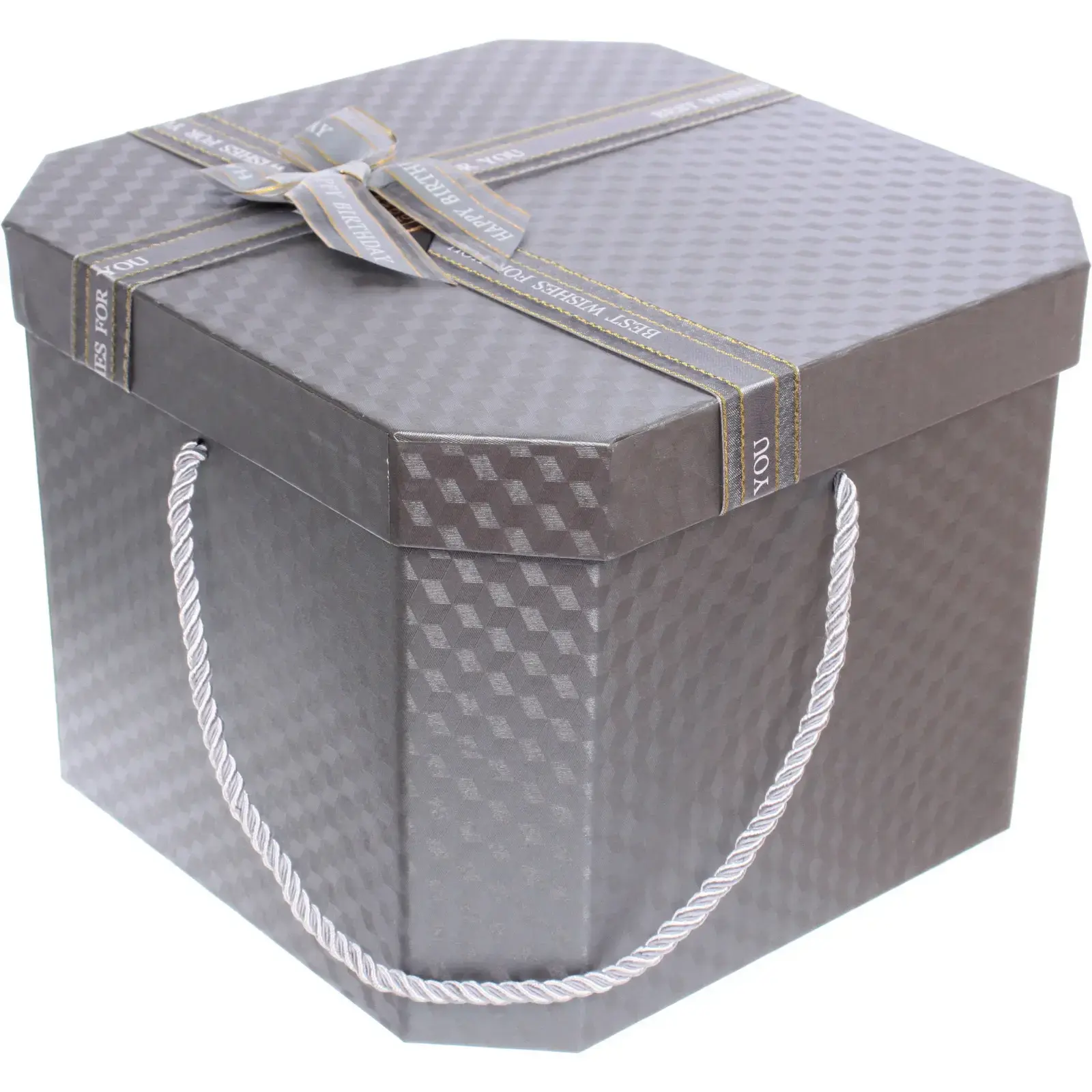 Коробка имеет размеры 24х24х18 см, что позволяет помещать в неё различные подарки, от мелких сувениров до более крупных предметов. Она идеально подходит для упаковки подарков на день рождения, юбилей или другие торжества. Удобная ручка из белой верёвки обеспечивает комфорт при переноске, а текстурированная поверхность добавляет элегантности.