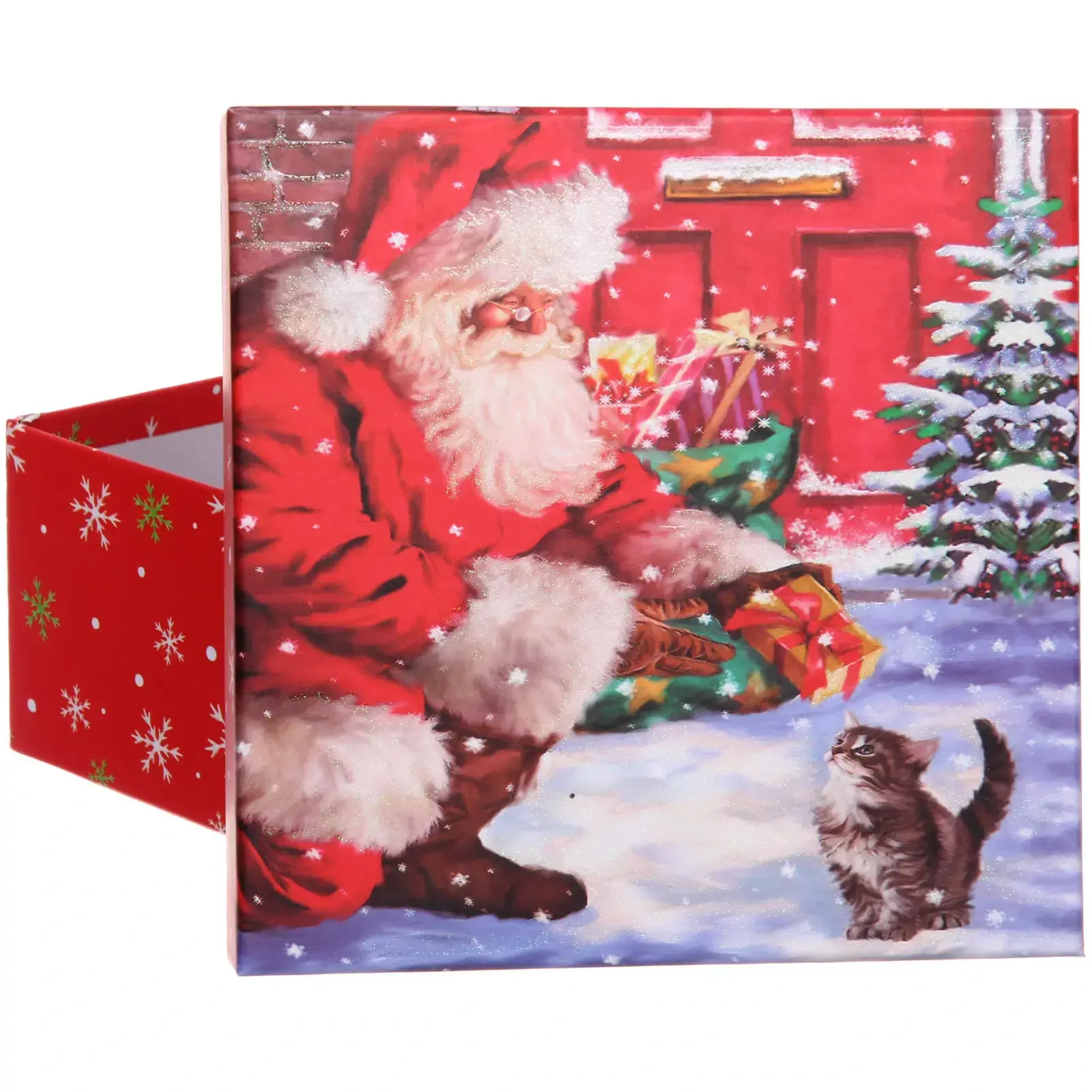 Коробка выполнена из качественного картона, что гарантирует её надежность. Яркий красный цвет с изображением Деда Мороза и кошки, а также снежинки на боках делают её идеальной для новогодних праздников. Не упустите возможность сделать ваши подарки ещё более запоминающимися с помощью этой стильной упаковки!