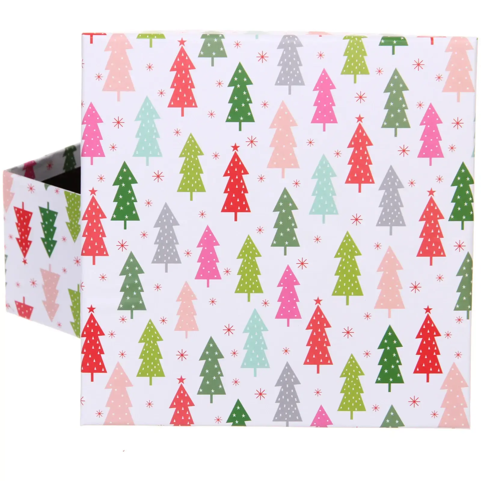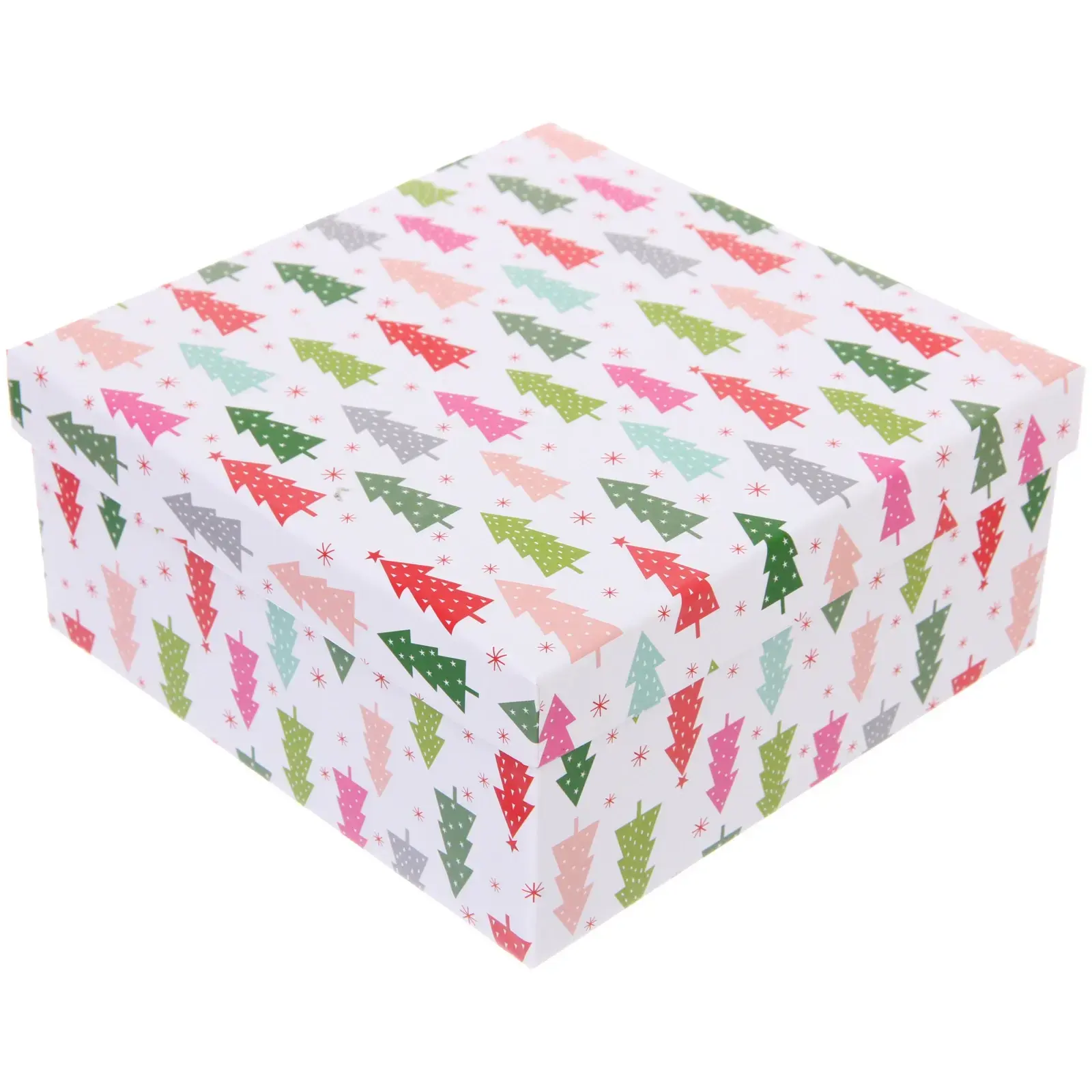 Коробка выполнена из качественного картона, что обеспечивает её прочность и долговечность. Новогодний принт с изображениями ёлочек в различных цветах, таких как красный, зелёный, розовый, серый и голубой, создаёт праздничное настроение. Белый фон с мелкими снежинками добавляет лёгкости и свежести, делая коробку привлекательной для глаз.