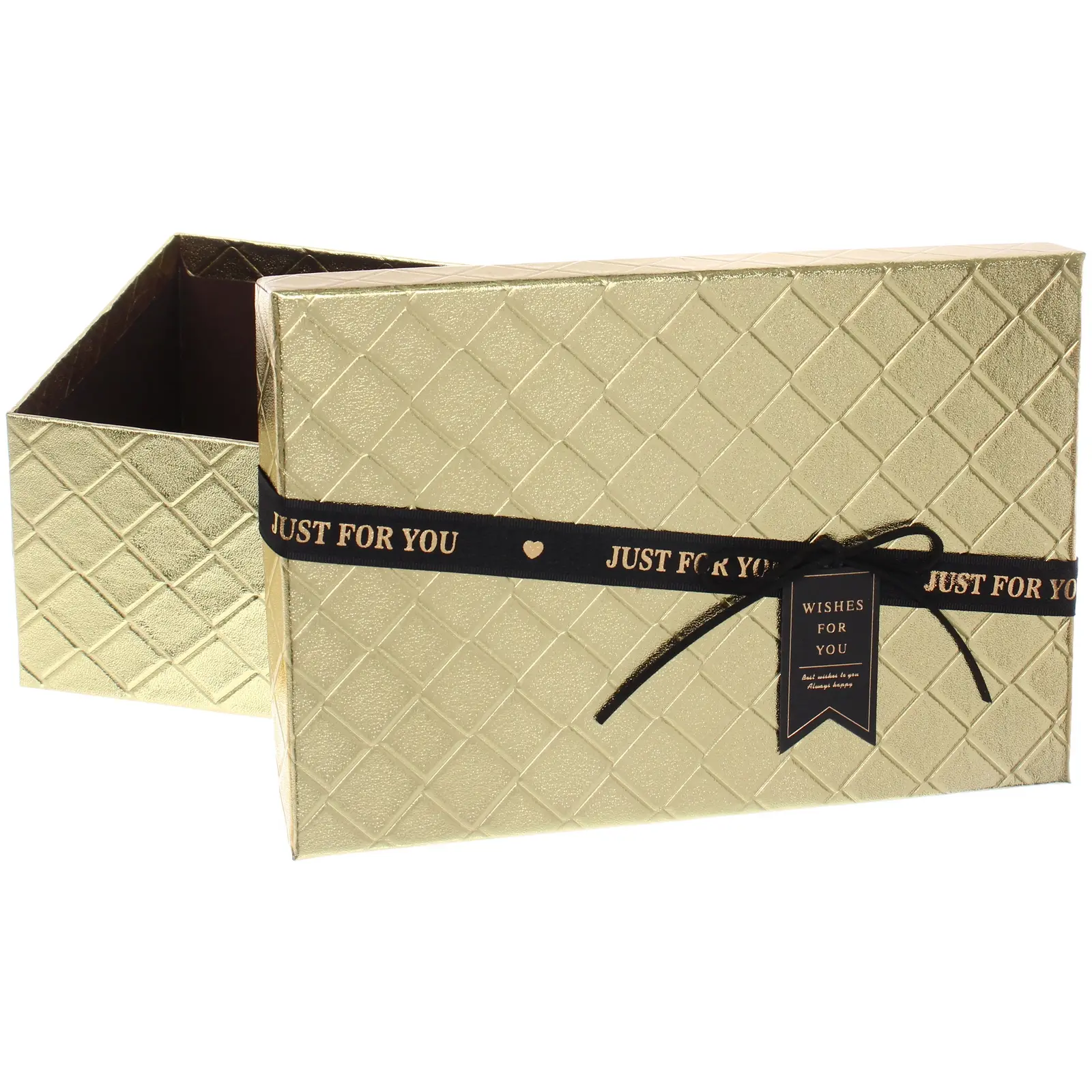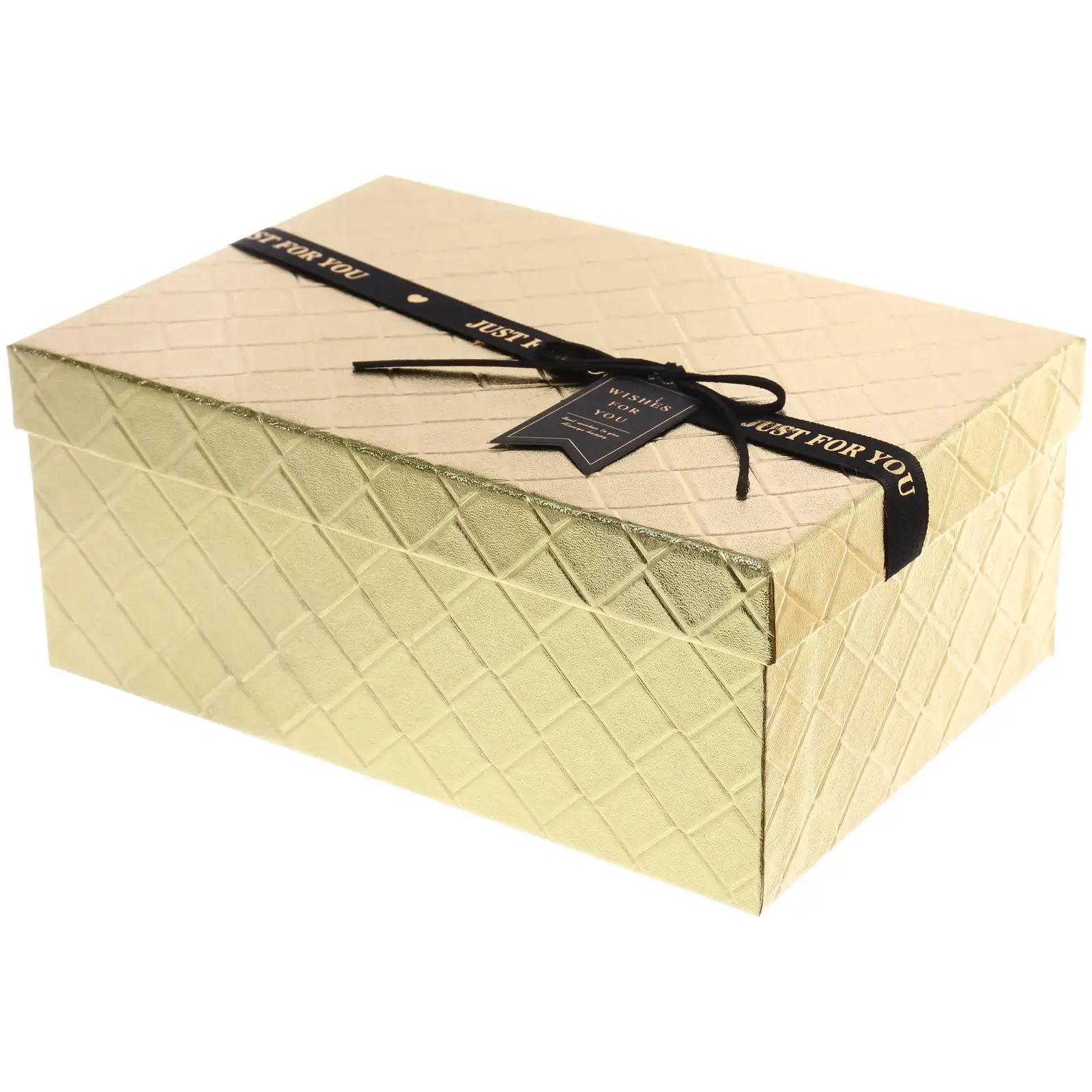 Изготовленная из качественного картона, эта коробка отличается прочностью и долговечностью. Золотистый цвет и рифленая текстура придают ей стильный вид, а декоративные элементы, такие как лента и бирка, делают её идеальным выбором для подарков. Не упустите возможность сделать ваш подарок по-настоящему запоминающимся с помощью этой великолепной коробки!