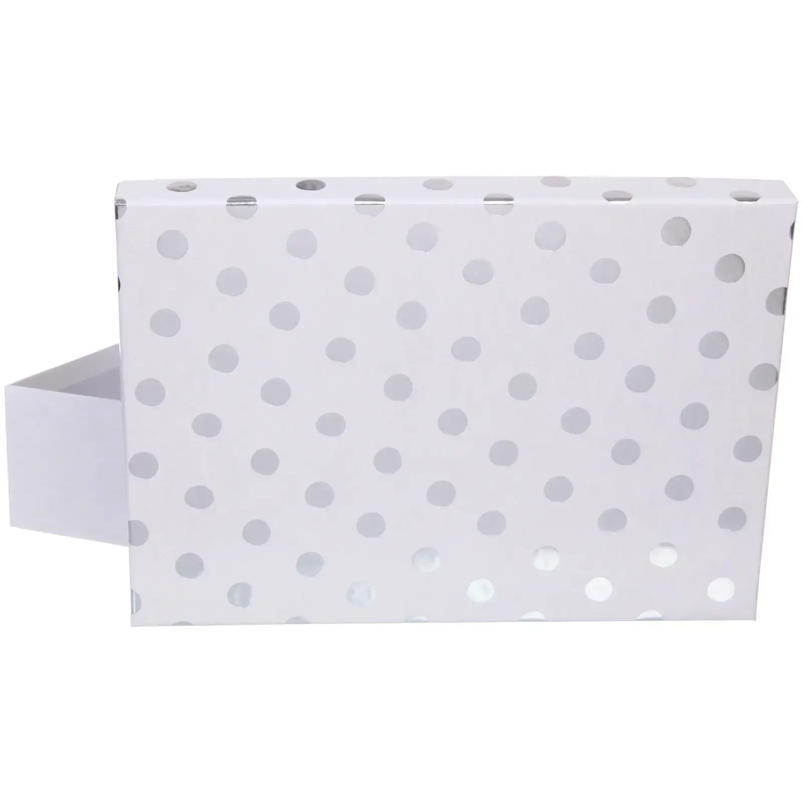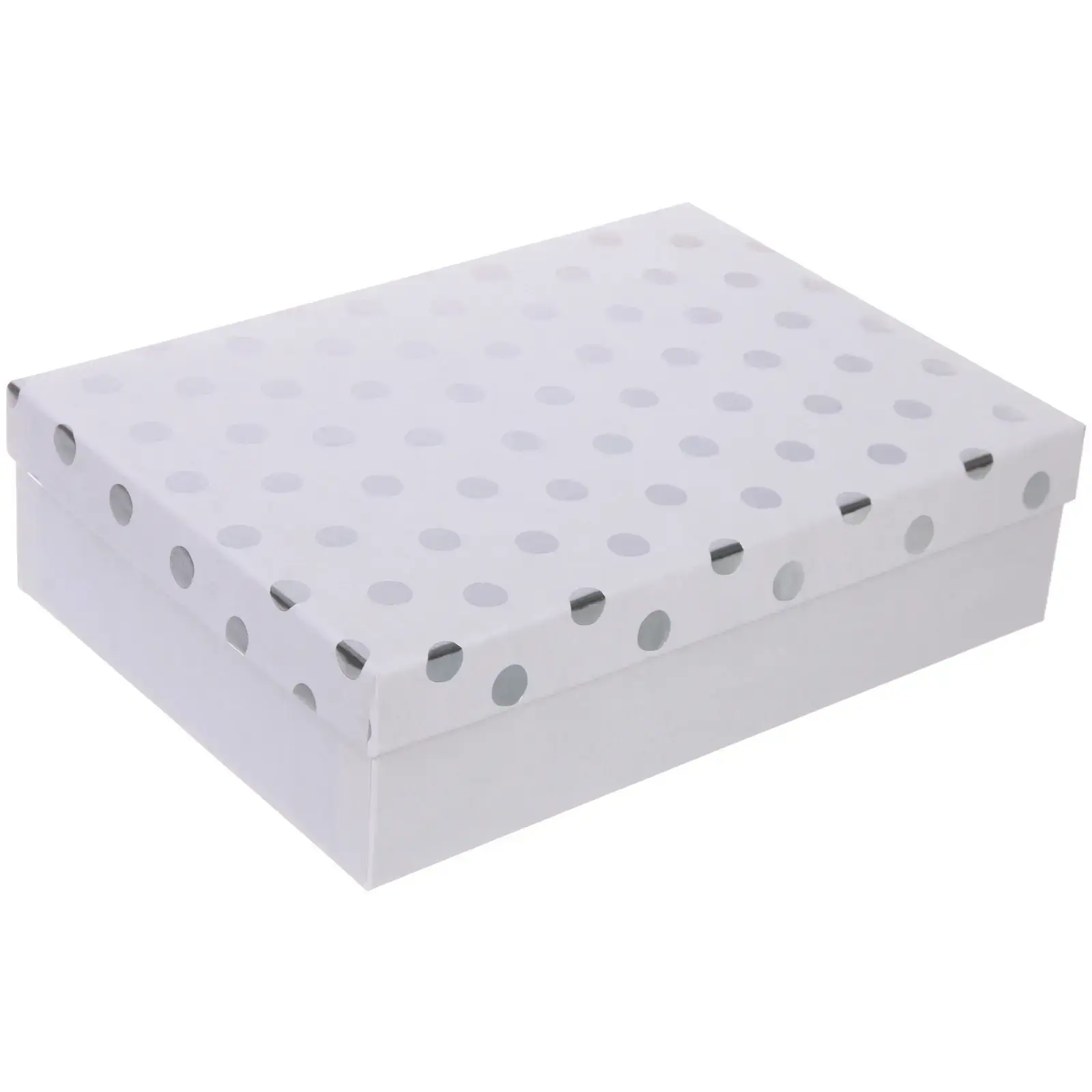 Коробка изготовлена из прочного картона, что гарантирует долговечность и защиту содержимого. Белый цвет с серыми круглыми точками придает ей современный и стильный вид, а минималистичный дизайн позволяет использовать коробку в различных интерьере. Благодаря качественным материалам, коробка легко открывается и закрывается, что делает процесс упаковки быстрым и удобным.