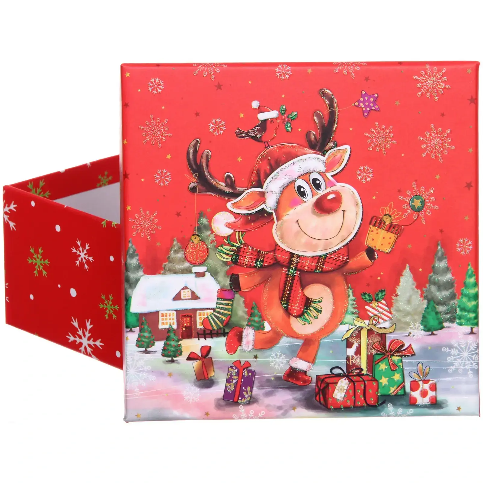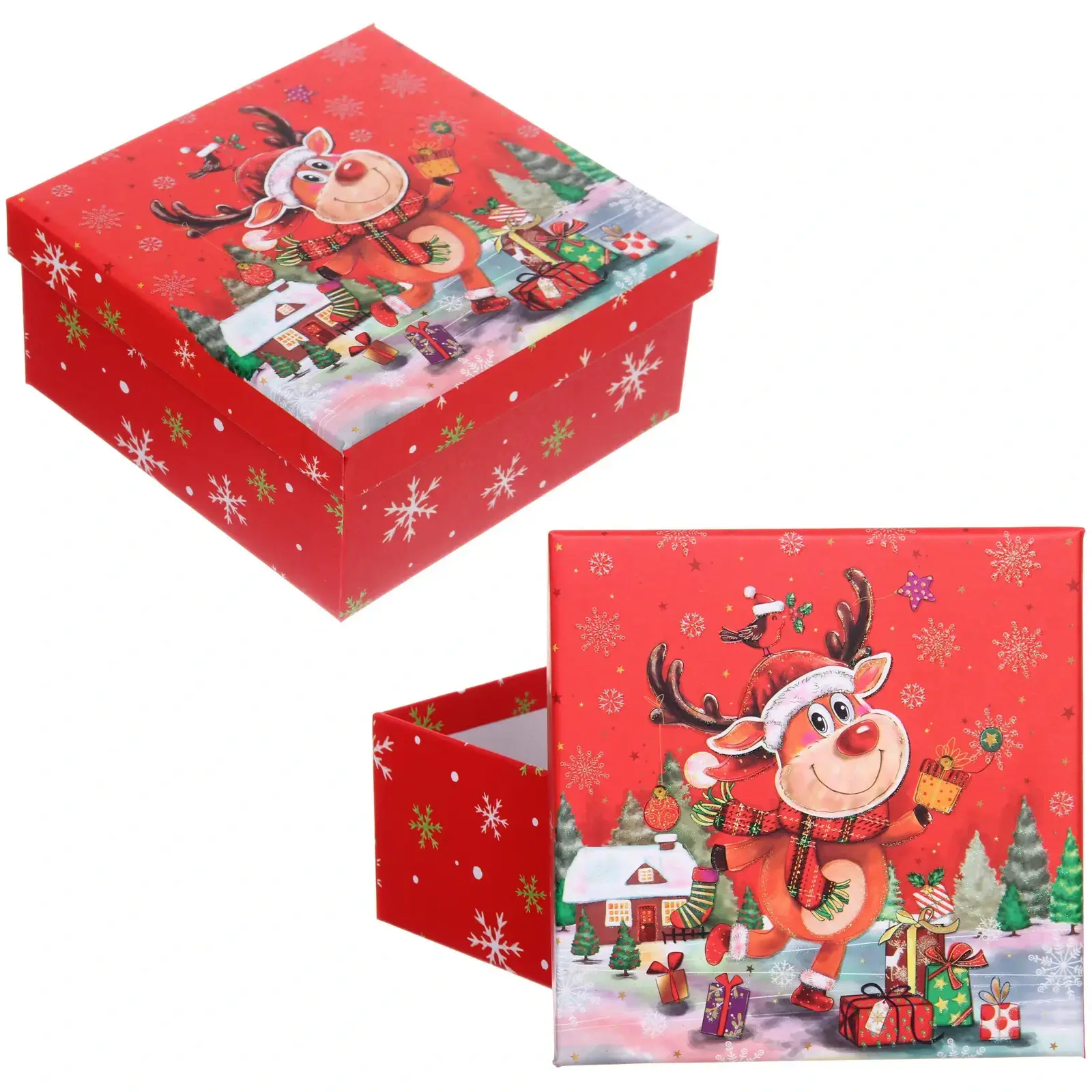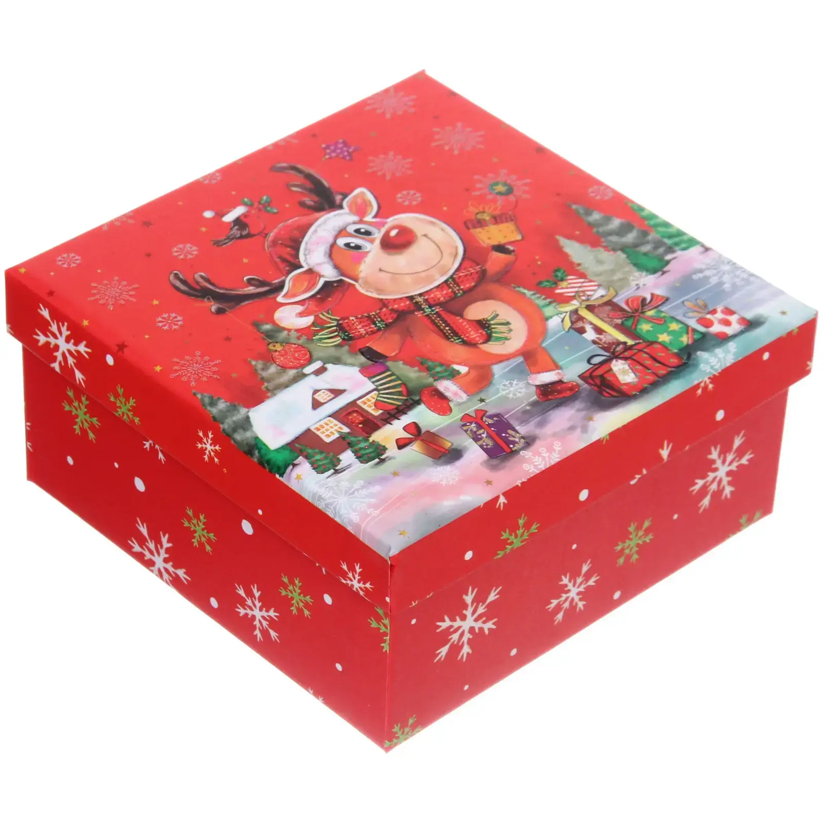 Создайте атмосферу праздника с подарочной коробкой «Новогодний гость». Эта яркая коробка станет идеальным решением для упаковки подарков на Новый год и Рождество, добавляя волшебства и радости в каждый момент. Красный цвет и веселый дизайн с оленем и зимними элементами создают праздничное настроение, которое порадует как дарителя, так и получателя.