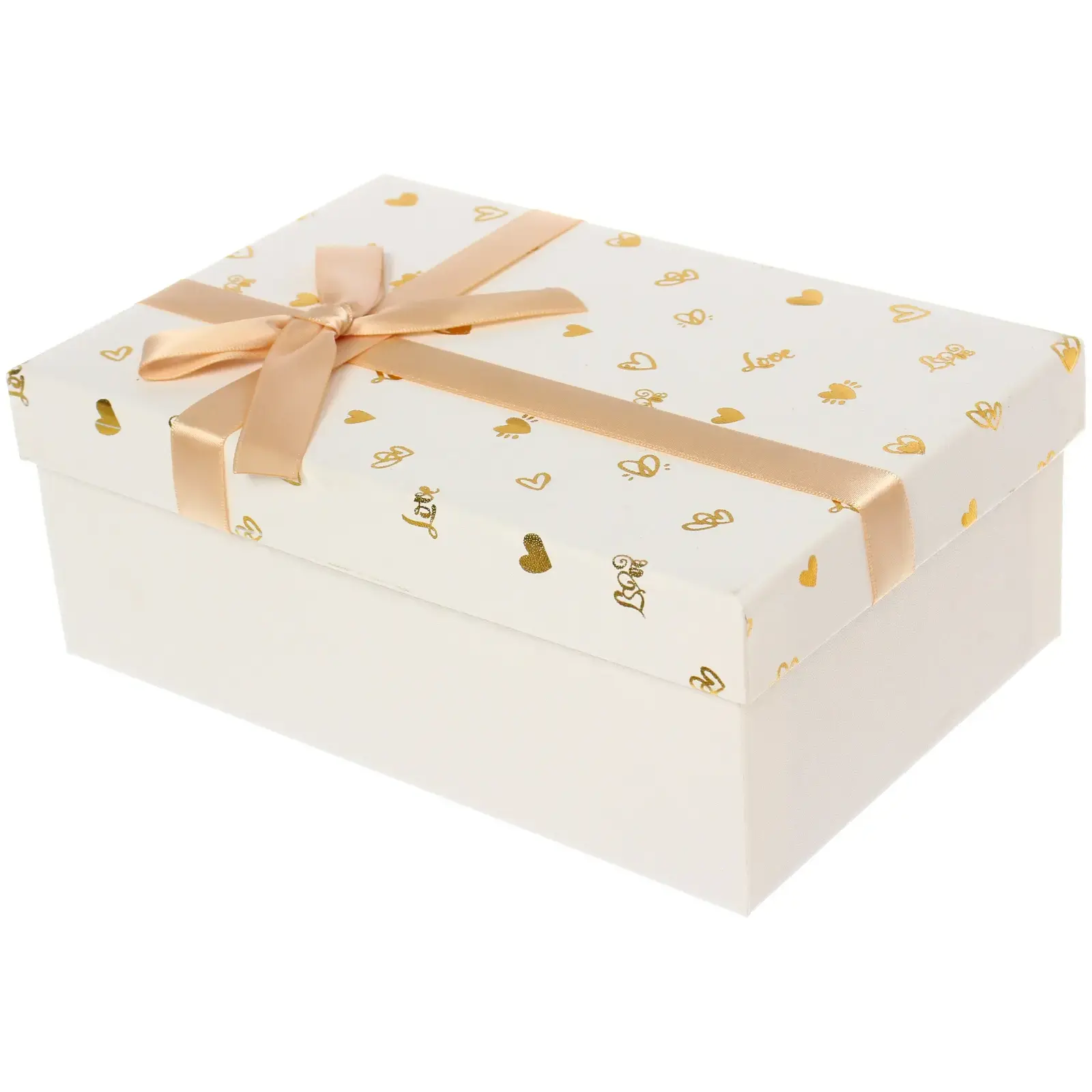 Подарочная коробка «Очарование» сочетает в себе практичность и изысканный дизайн, создавая идеальную презентацию для ваших сюрпризов. Золотые узоры в виде сердец и деликатный бант из атласной ленты превращают обычную упаковку в произведение искусства.