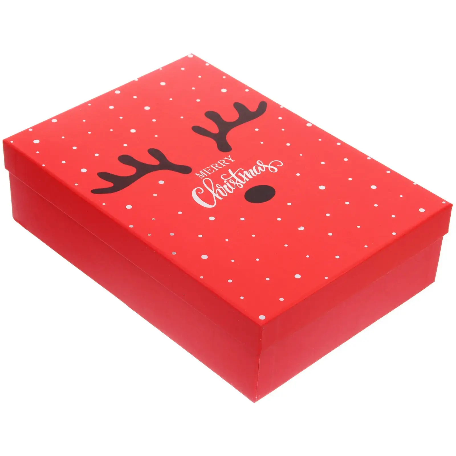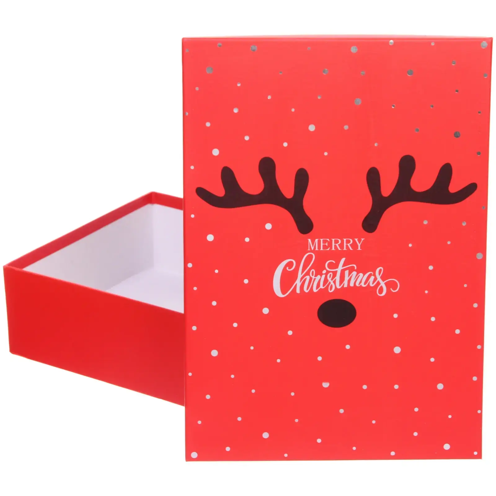 Подарочная коробка с рождественским дизайном создаст волшебное настроение еще до вскрытия упаковки. Яркий красный фон с белоснежными снежинками и стилизованными оленьими рогами превратит любой подарок в особенный сюрприз.