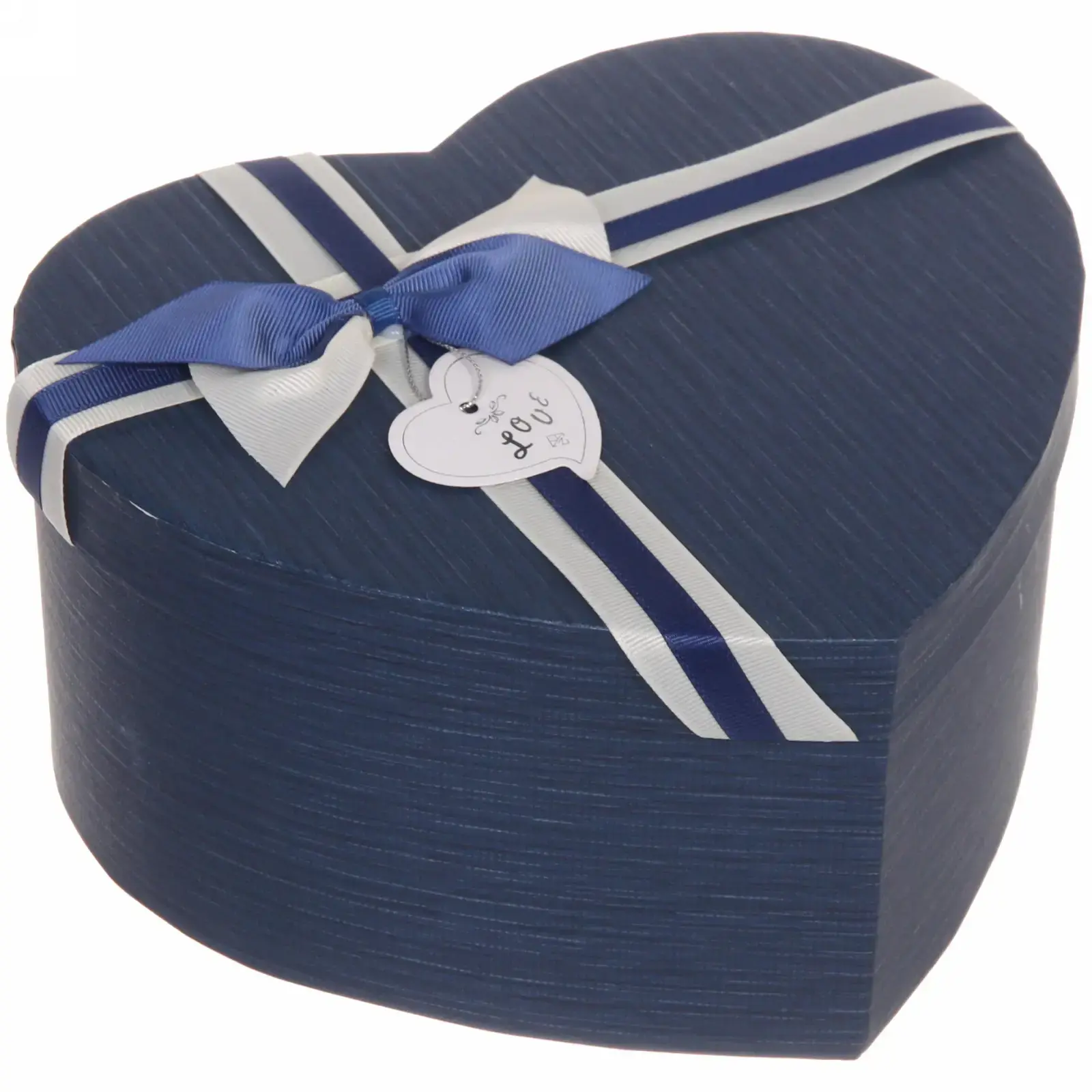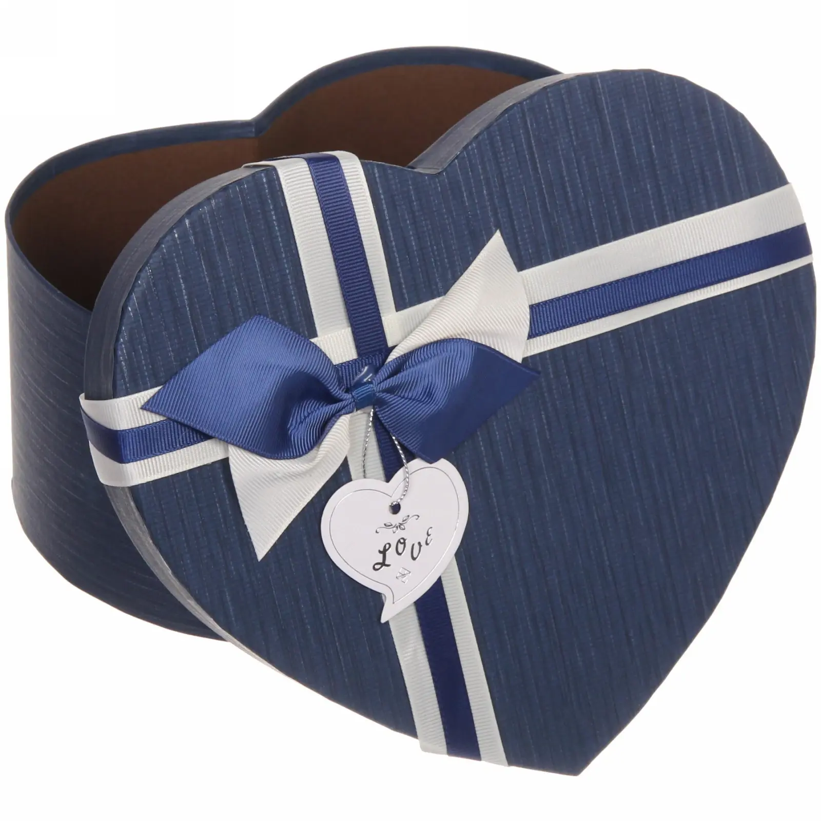 Коробка выполнена в темно-синем цвете, что придает ей стильный и современный вид. Текстурированная поверхность с вертикальными линиями создает эффект объема, а круглой формы тег с надписью «Love» добавляет романтический акцент. Внутренняя часть коробки имеет коричневый цвет, что делает ее универсальной для любых подарков.
