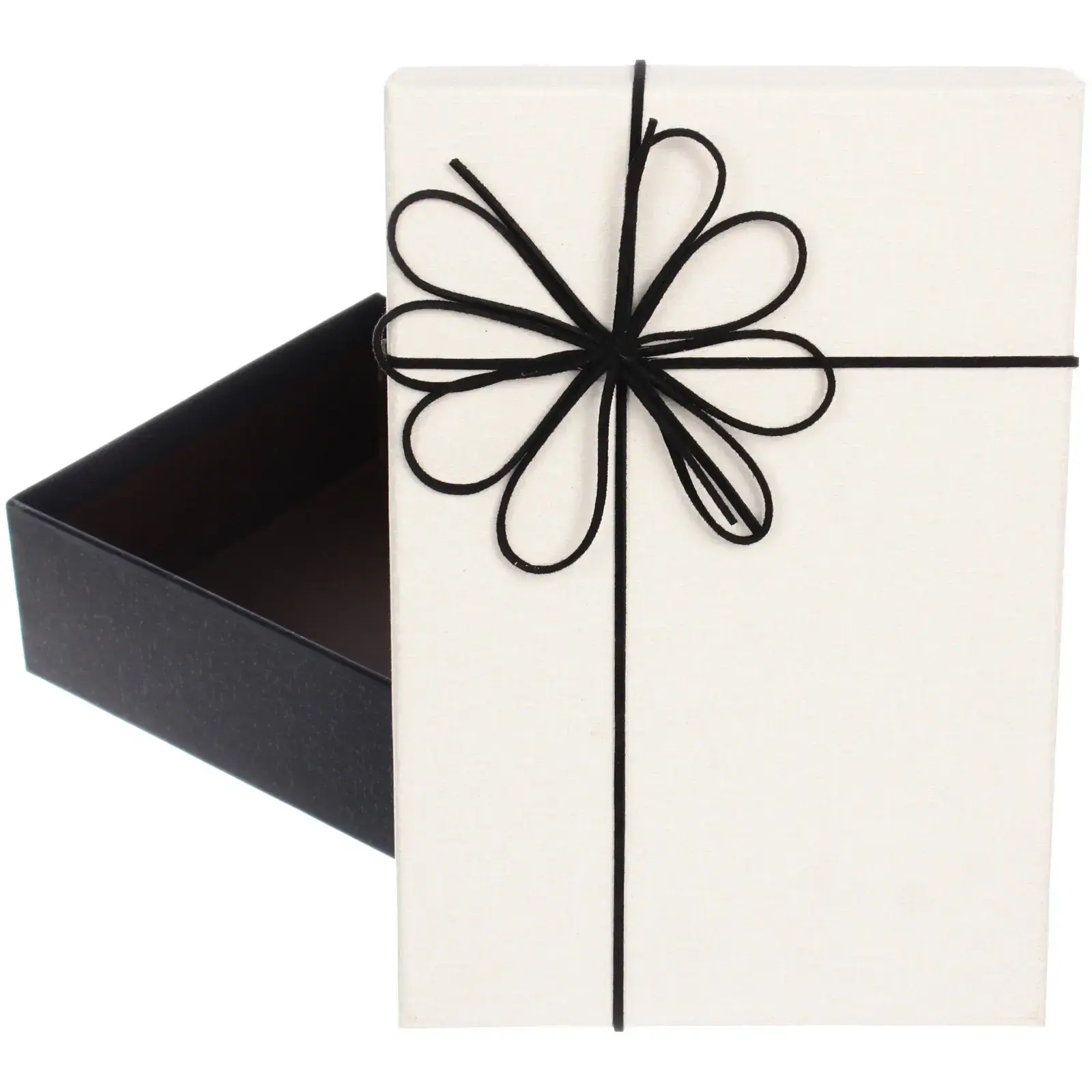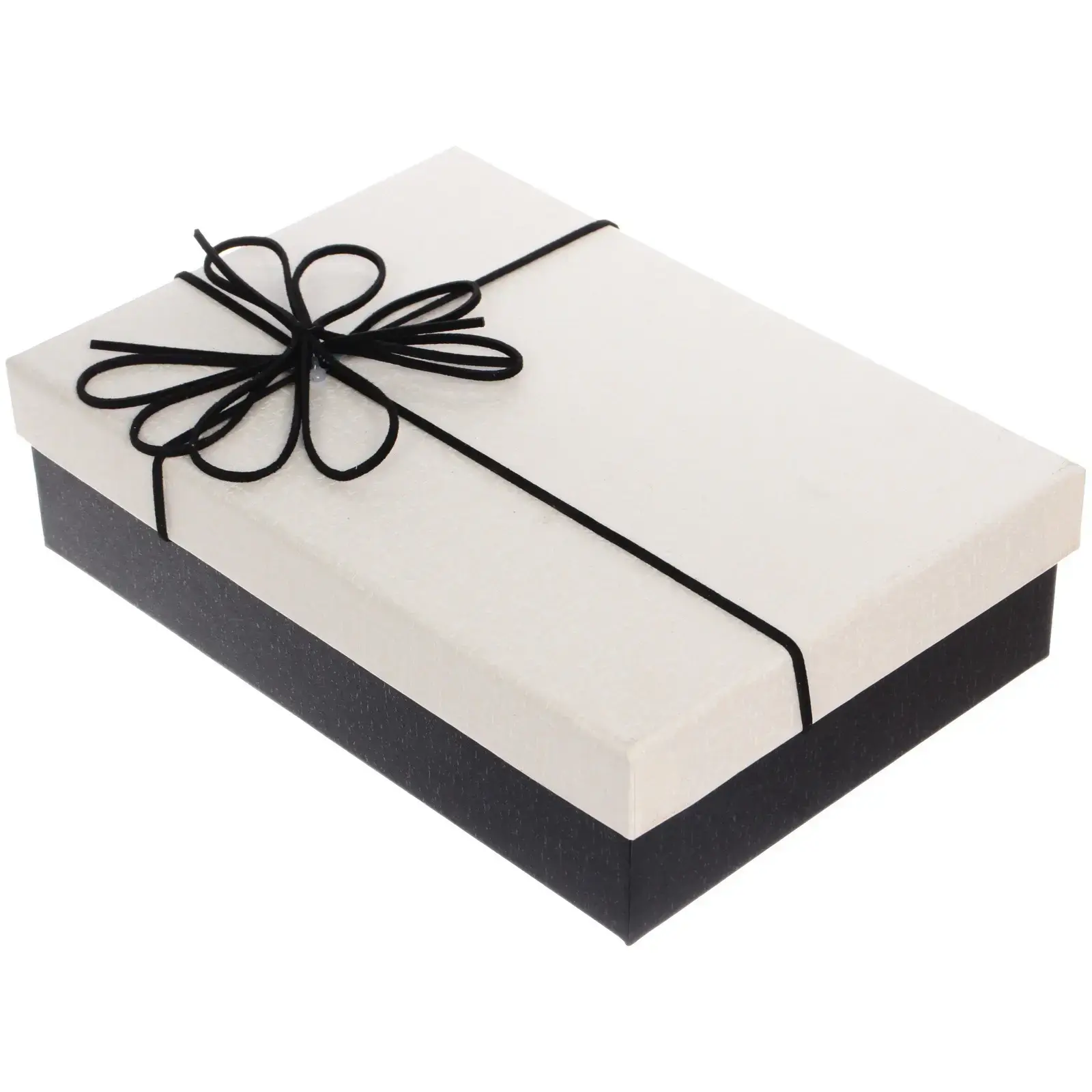 Коробка подходит для упаковки подарков на любые праздники: дни рождения, свадьбы, юбилеи и другие важные события. Она легко открывается и закрывается, что делает процесс упаковки быстрым и удобным. Благодаря стильному дизайну с черной лентой, завязанной в виде банта, коробка выглядит презентабельно и привлекательно.
