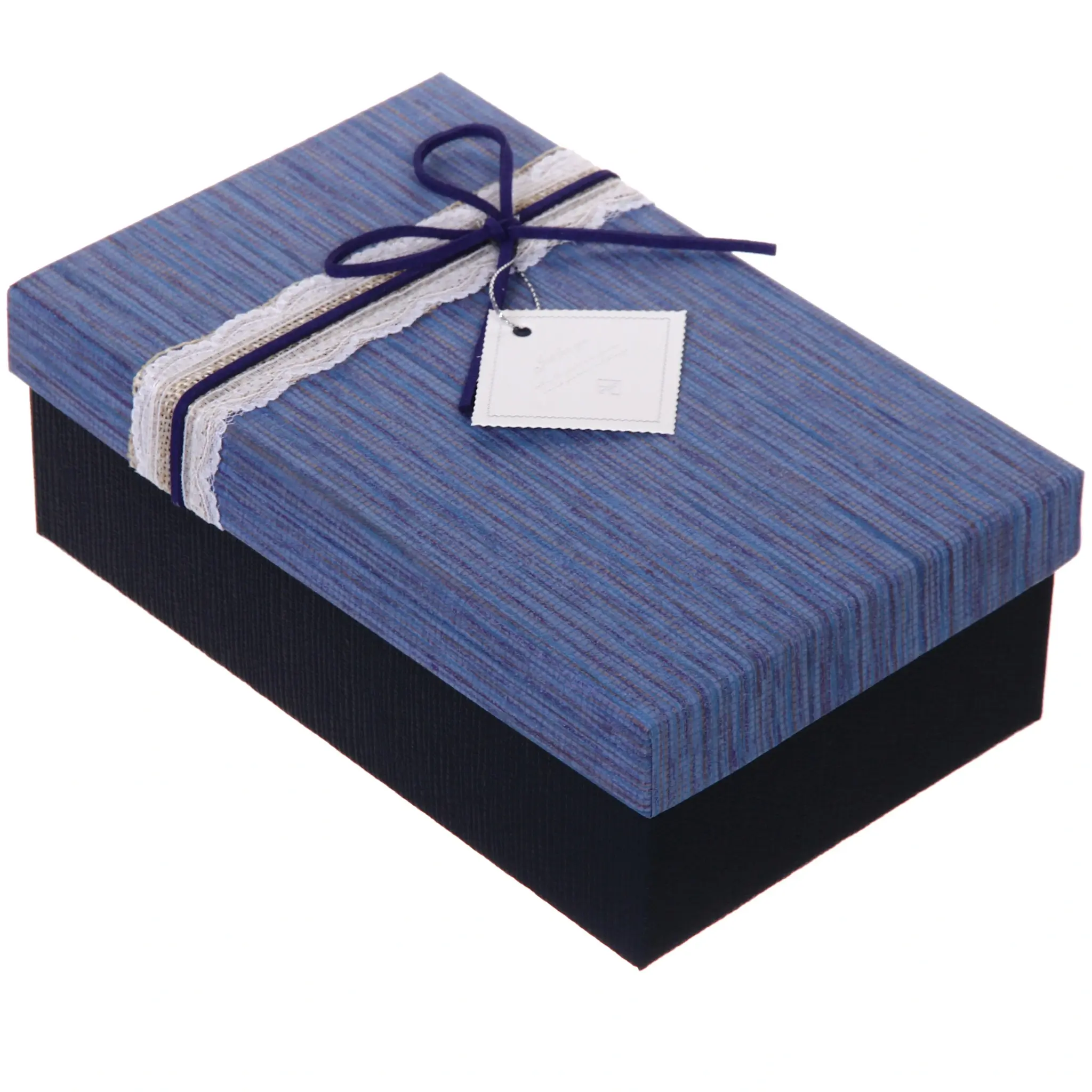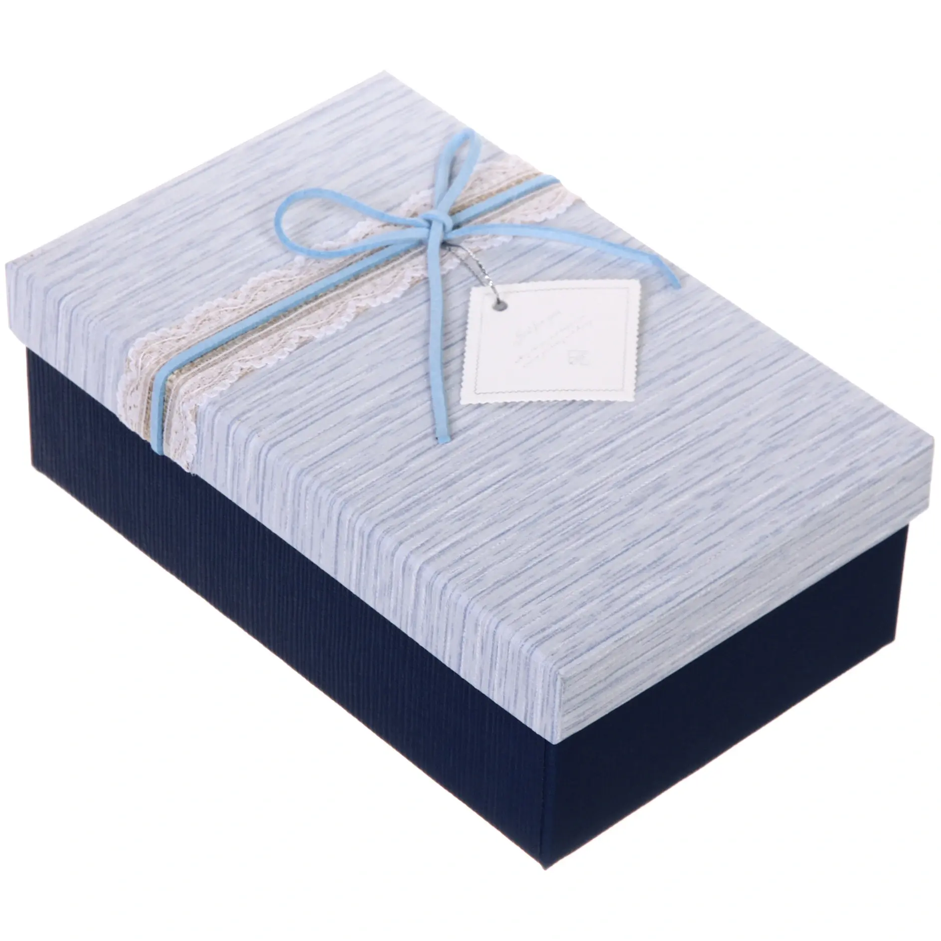 Коробка выполнена в нежных цветах: верхняя часть светло-голубая с текстурированной поверхностью, а нижняя — темно-синяя с ребристой текстурой. Декоративная лента и кружевной элемент придают ей особый шарм. Коробка станет не только упаковкой, но и частью подарка, которую приятно будет сохранить.