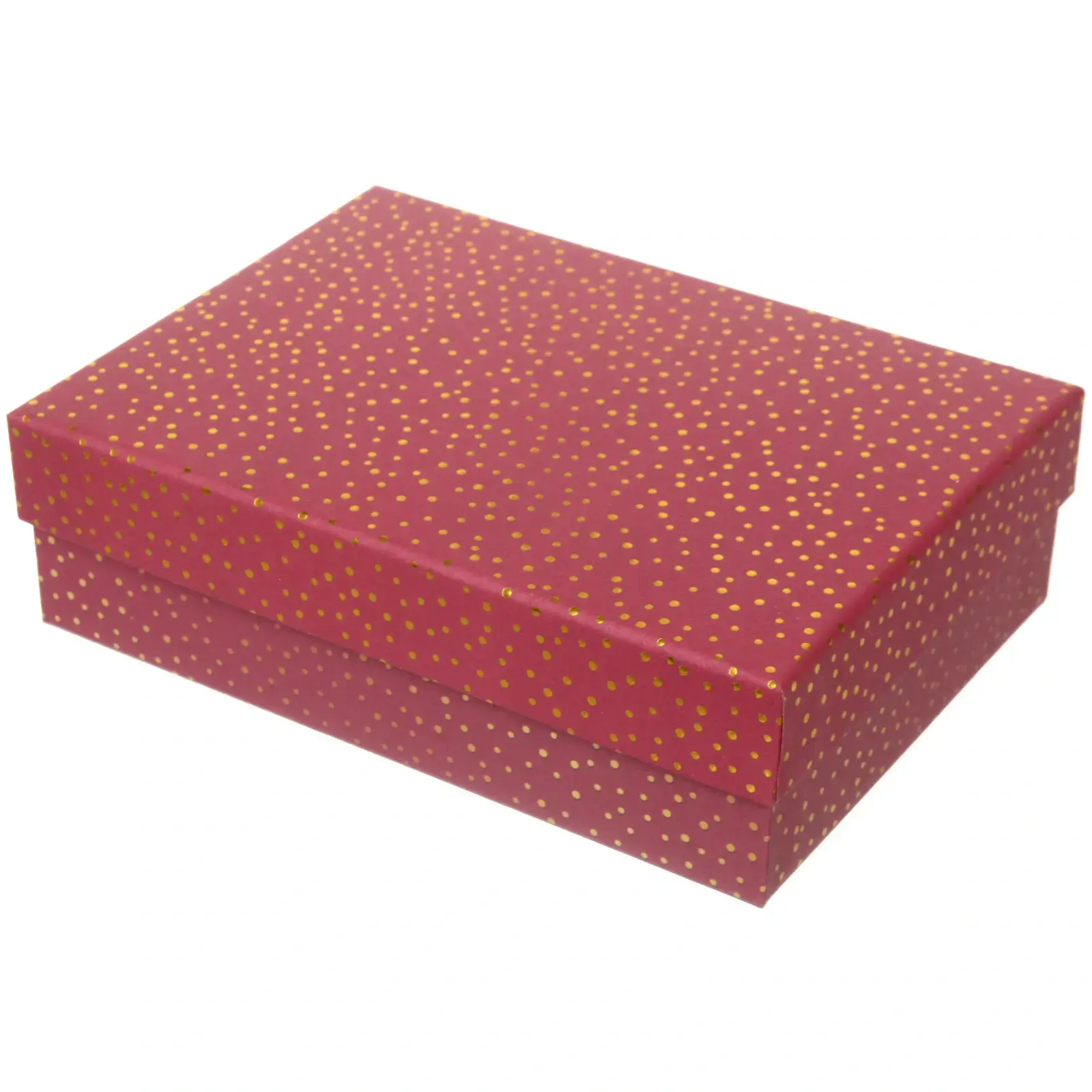 Коробка выполнена из качественного картона, что гарантирует её надежность. Размеры 22х16х6,5 см позволяют использовать её для различных целей, будь то упаковка подарков или хранение мелочей. Красный цвет с золотыми точками делает её идеальной для праздничных мероприятий, добавляя яркие акценты в ваш праздник.