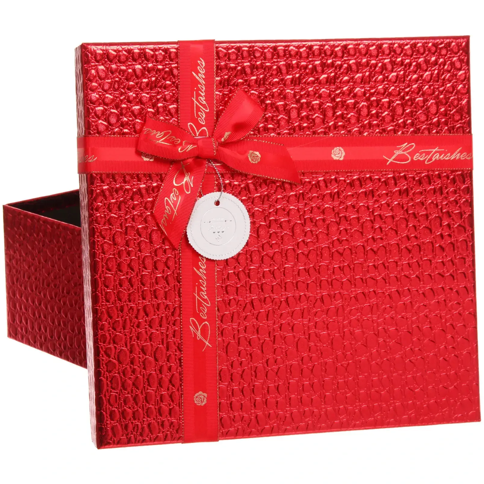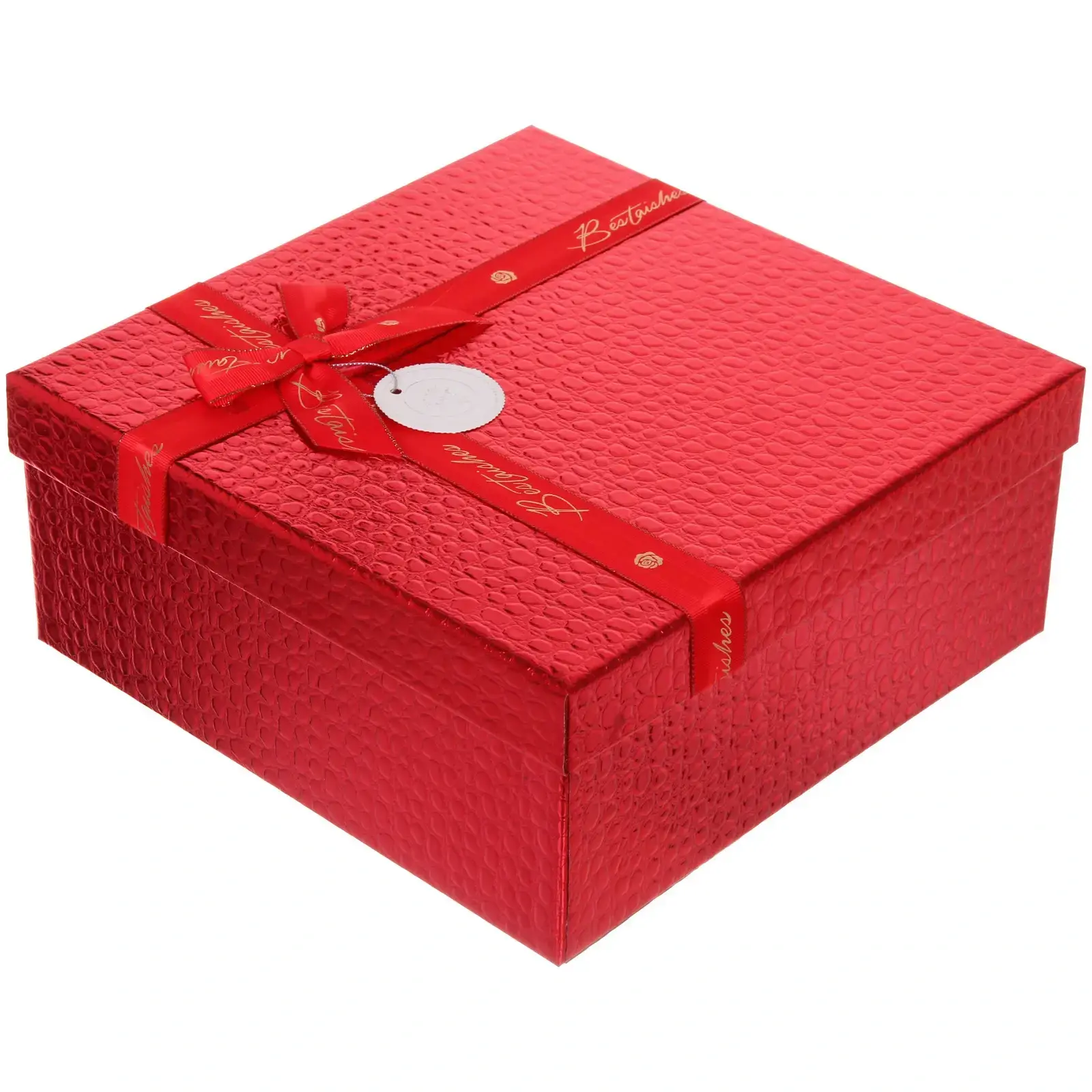 Коробка имеет размеры 27х27х11,5 см, что делает её универсальной для упаковки различных подарков. Она подходит как для небольших сувениров, так и для более крупных предметов. Лента с надписью «Best wishes» добавляет особый шарм и делает упаковку ещё более привлекательной. Коробка открывается с одной стороны, что позволяет легко укладывать подарки и демонстрировать их содержимое.