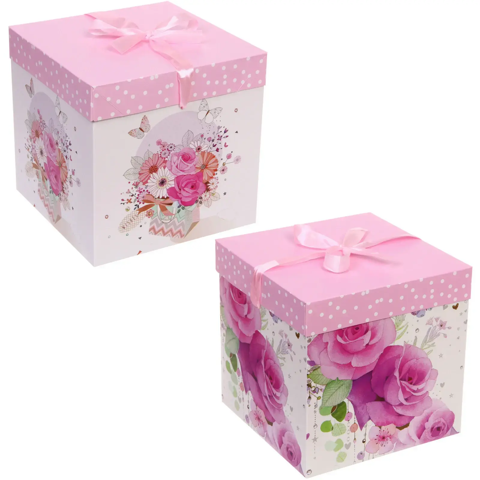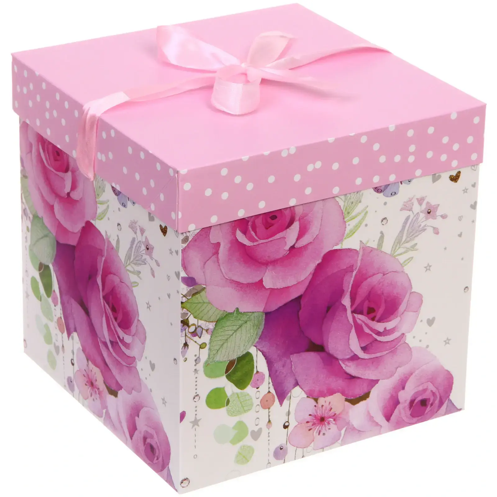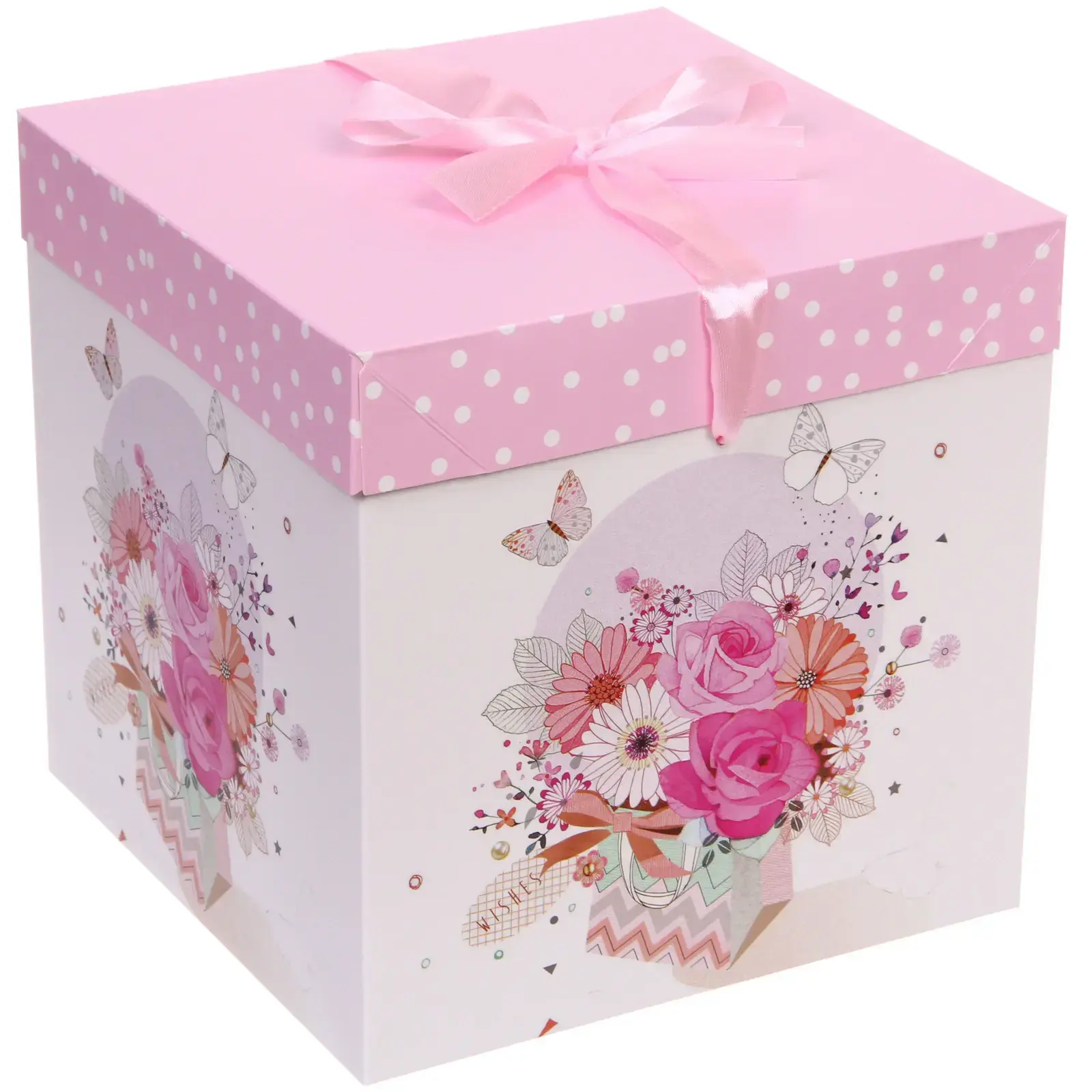 Элегантное сочетание белого фона с розовыми акцентами и цветочным орнаментом делает эту коробку универсальным решением для различных случаев – от дней рождения до корпоративных мероприятий.