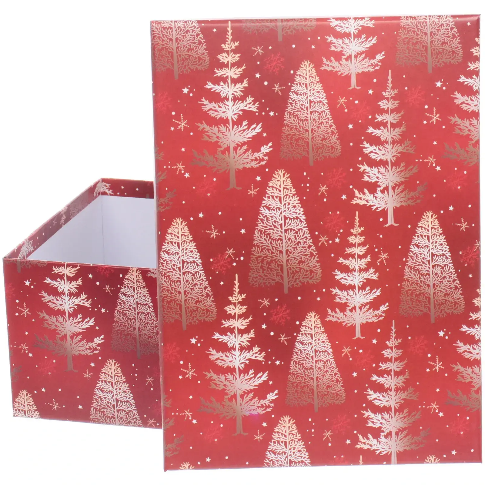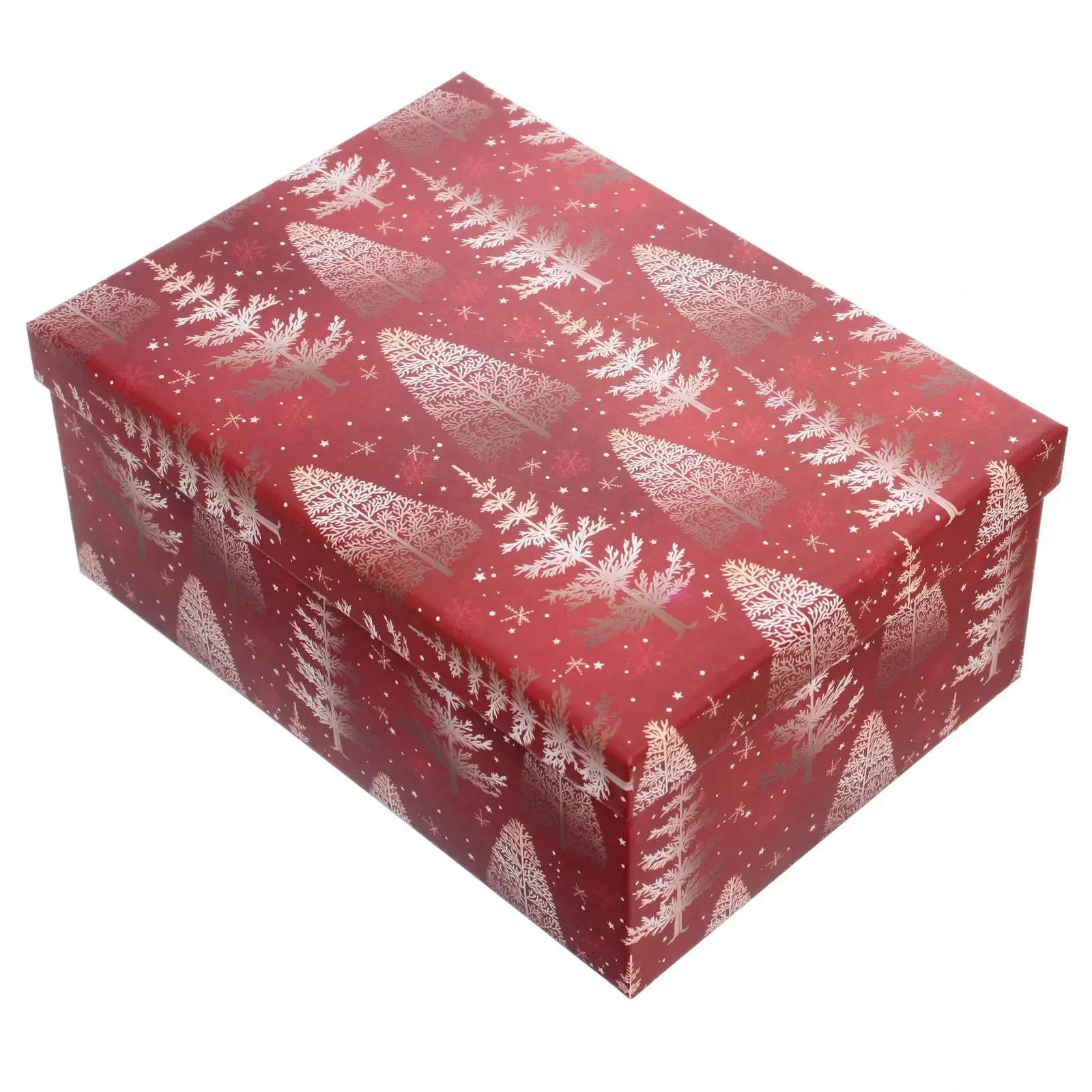 Коробка выполнена из качественного картона, что обеспечивает её долговечность и устойчивость к повреждениям. Красный цвет с металлическим блеском и принт с елочками и снежинками делают её привлекательной и стильной. Внутренняя часть коробки белого цвета, что добавляет контраст и делает упаковку ещё более эффектной.