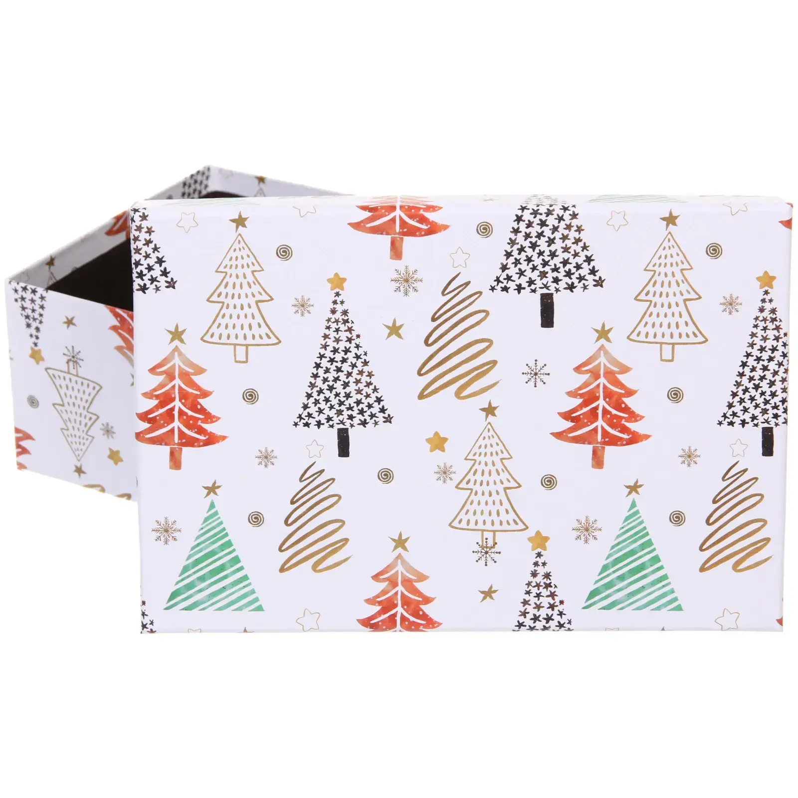 Коробка имеет белый фон с яркими рисунками елок, звезд и снежинок, что делает её идеальной для новогоднего оформления. Внутренняя сторона коробки выполнена в темном цвете, что придаёт ей стильный вид. Не упустите возможность сделать ваш подарок особенным с помощью этой красивой коробки!
