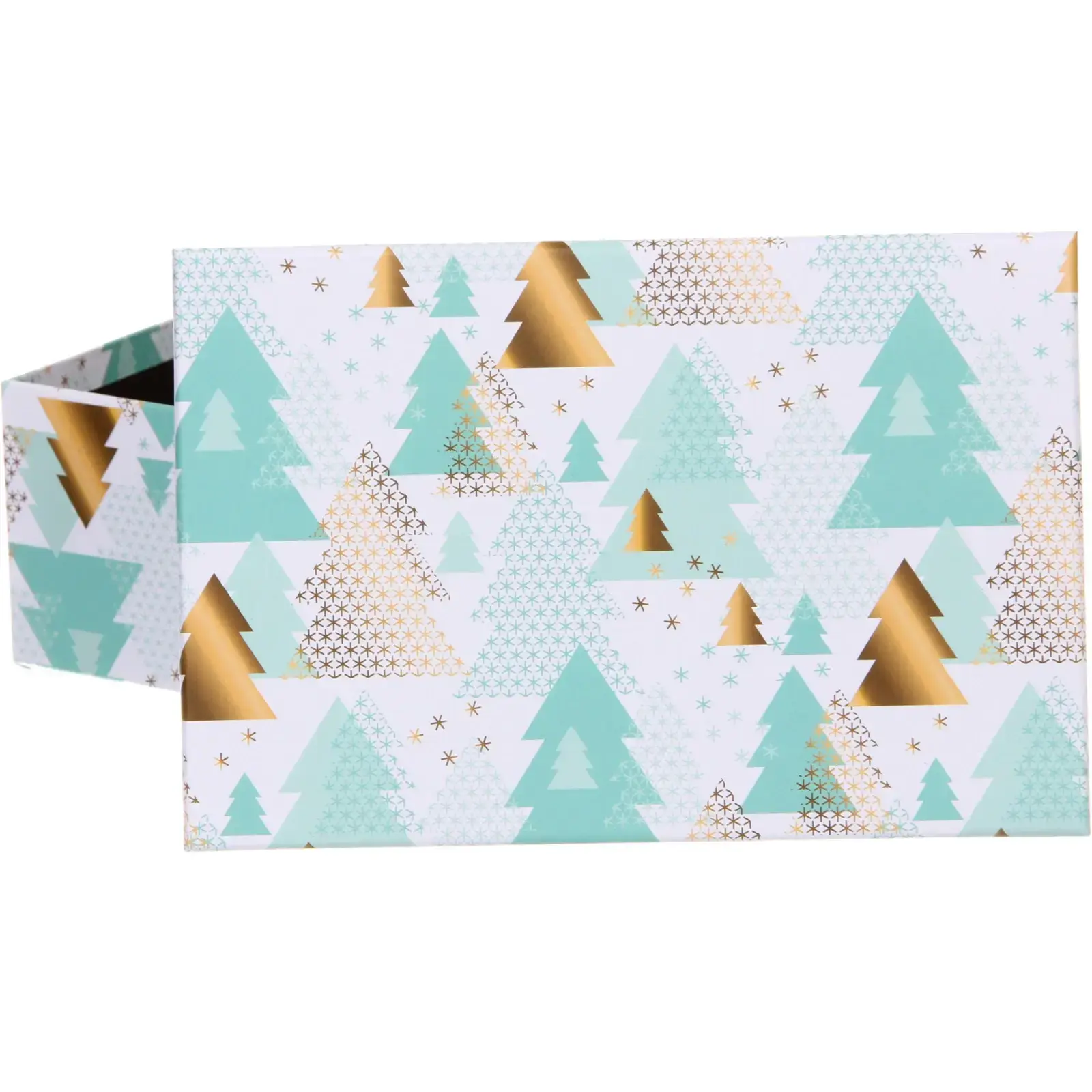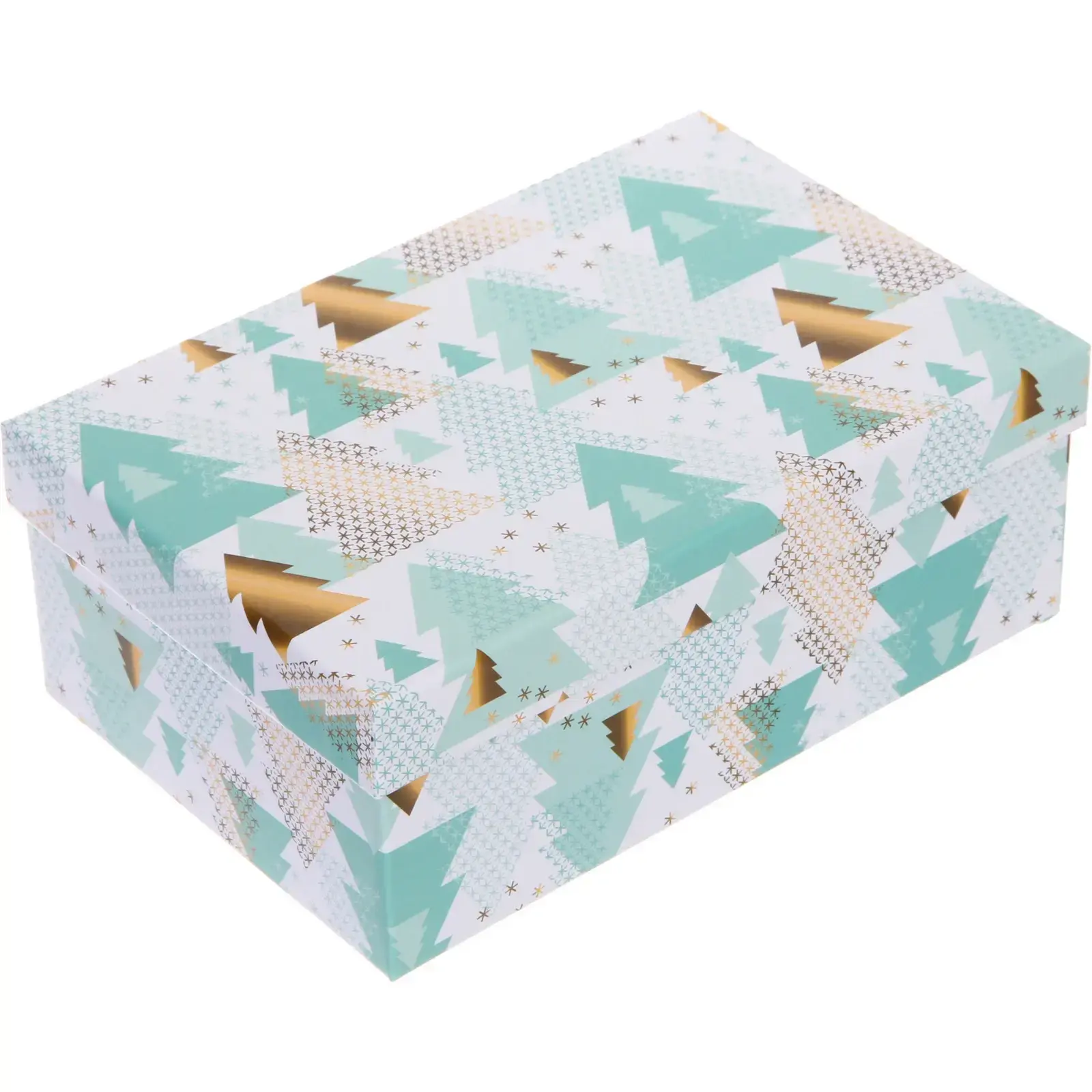 Коробка украшена элегантными стилизованными елками и звездочками в бело-зелено-золотой цветовой гамме. Такая расцветка создает праздничное настроение и подходит как для взрослых, так и для детских подарков.