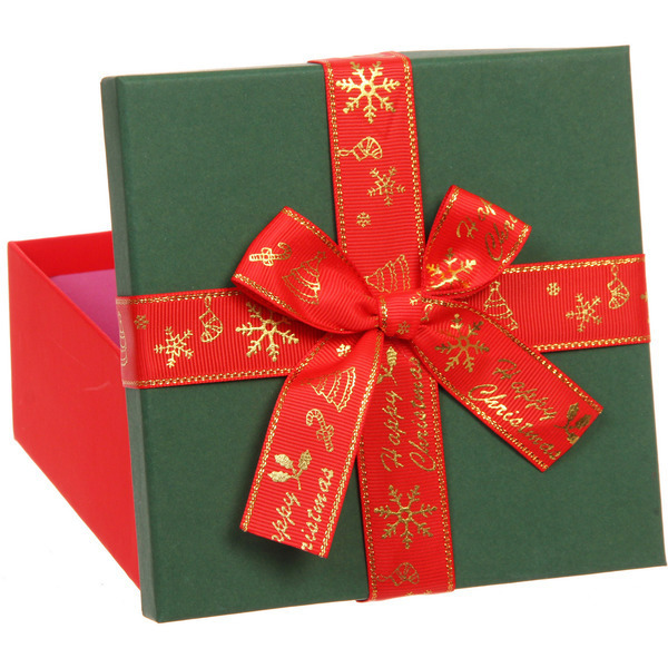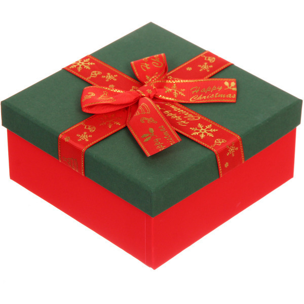 Коробка изготовлена из качественного картона, что обеспечивает ее прочность и долговечность. Яркий зеленый цвет верхней части и красная внутренняя часть создают праздничное настроение. Красная атласная лента, завязанная в бантик, добавляет изысканности и делает коробку готовой к вручению. На ленте присутствуют золотые надписи и новогодние символы, что подчеркивает ее тематику.