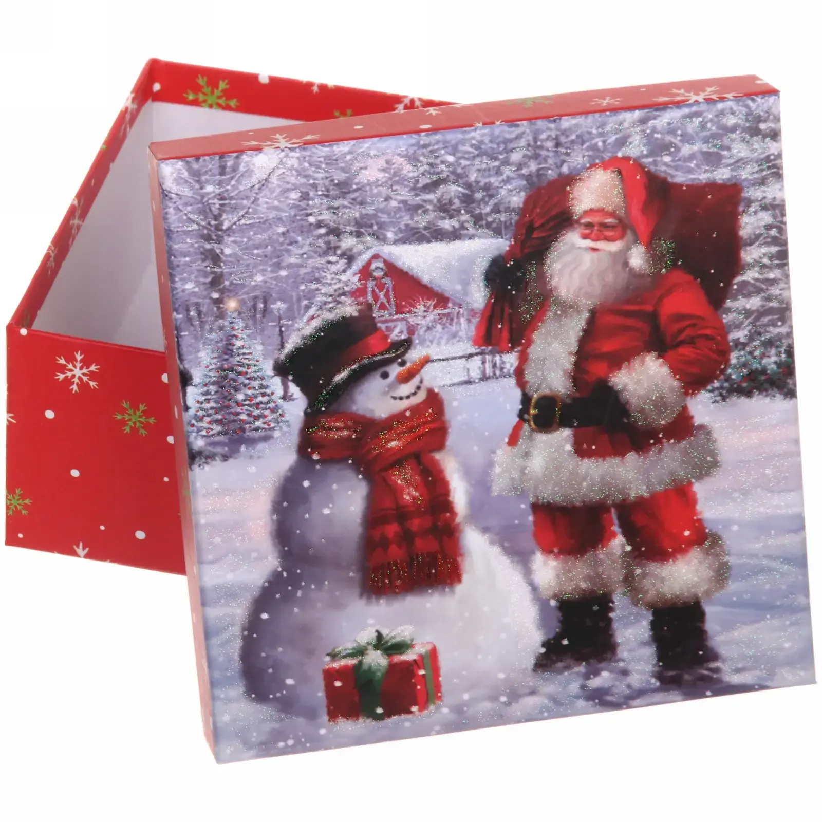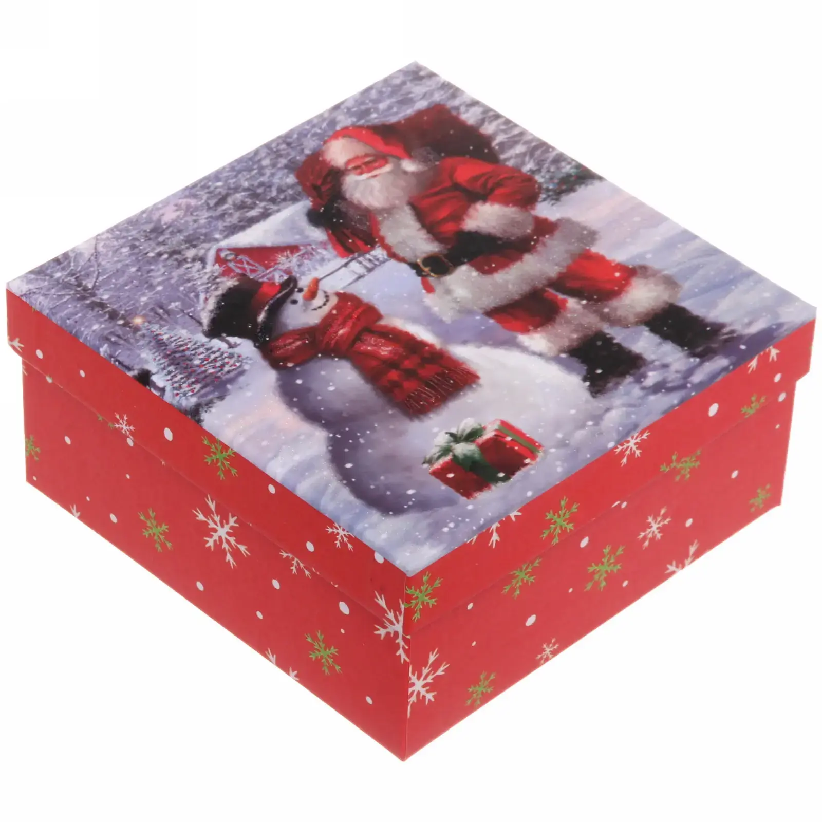 Коробка изготовлена из плотного картона, что обеспечивает надежность и защиту содержимого. Её яркий и привлекательный дизайн с изображениями Санта-Клауса и снеговика создаст волшебное настроение и станет отличным дополнением к любому подарку. Праздничный вид коробки делает её идеальной для использования в новогодние праздники, а также для других торжеств.
