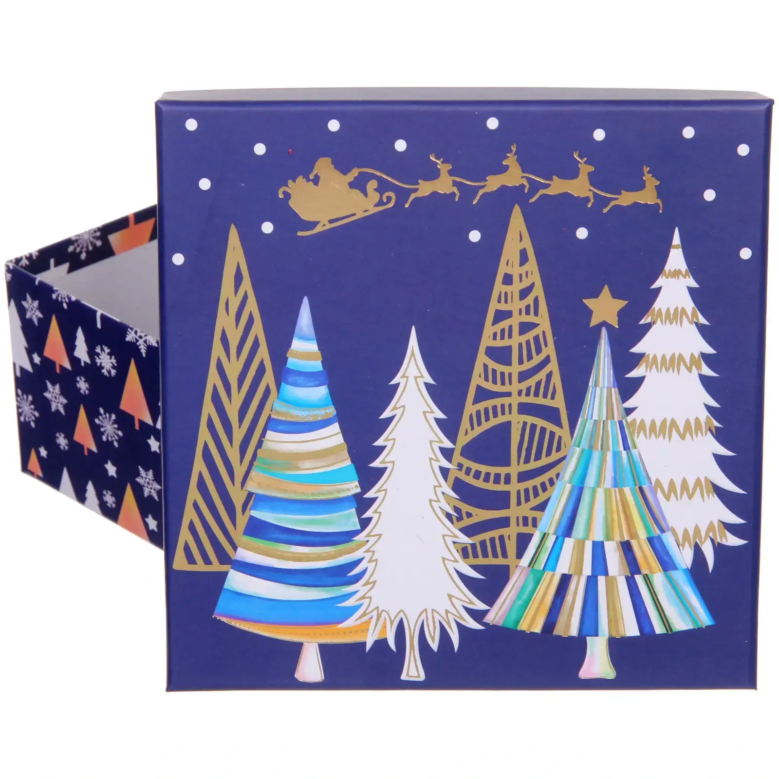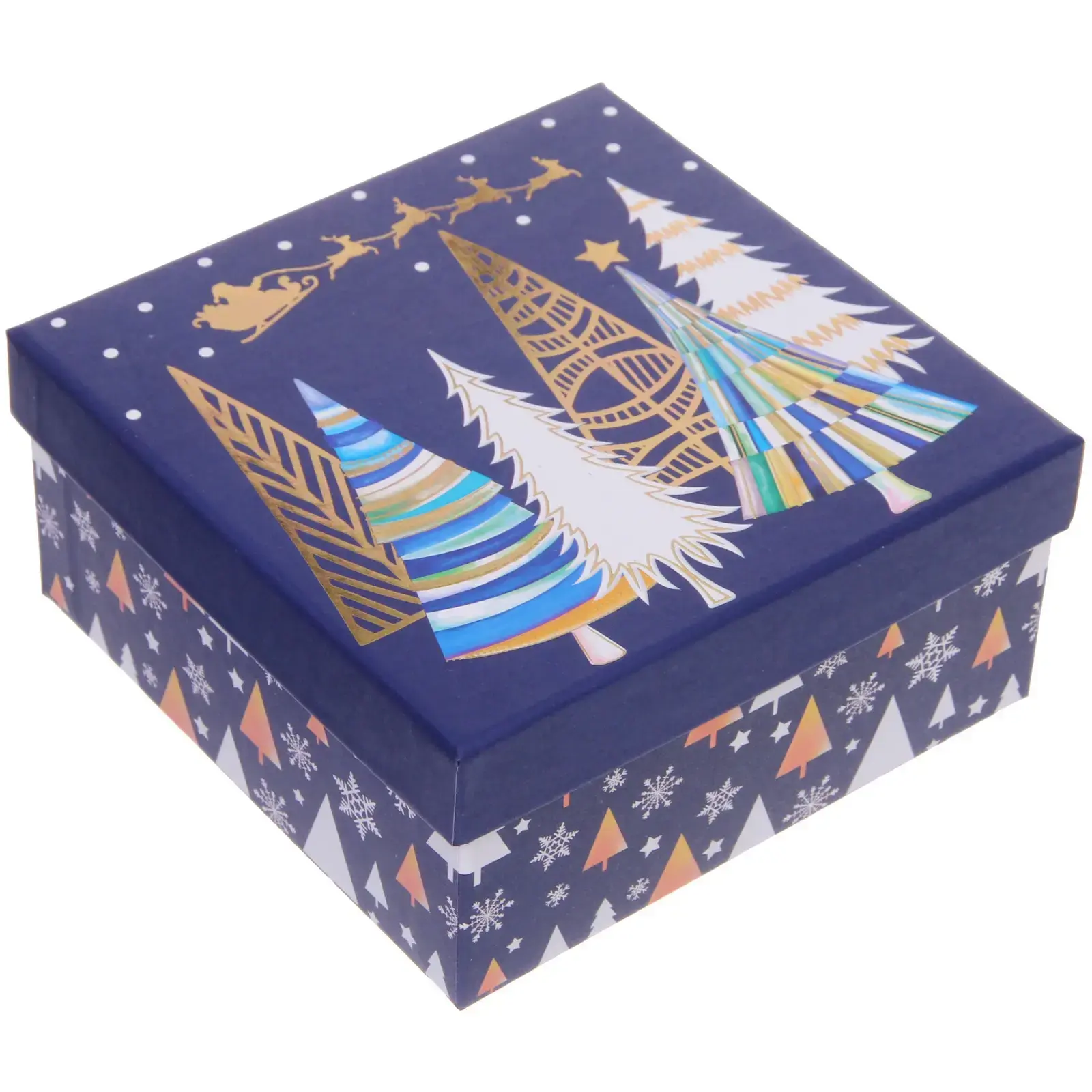 Коробка украшена стилизованными елками, снежинками и изображениями Санта-Клауса, что делает ее самостоятельным подарком. Матовая и глянцевая текстуры создают премиальный внешний вид.