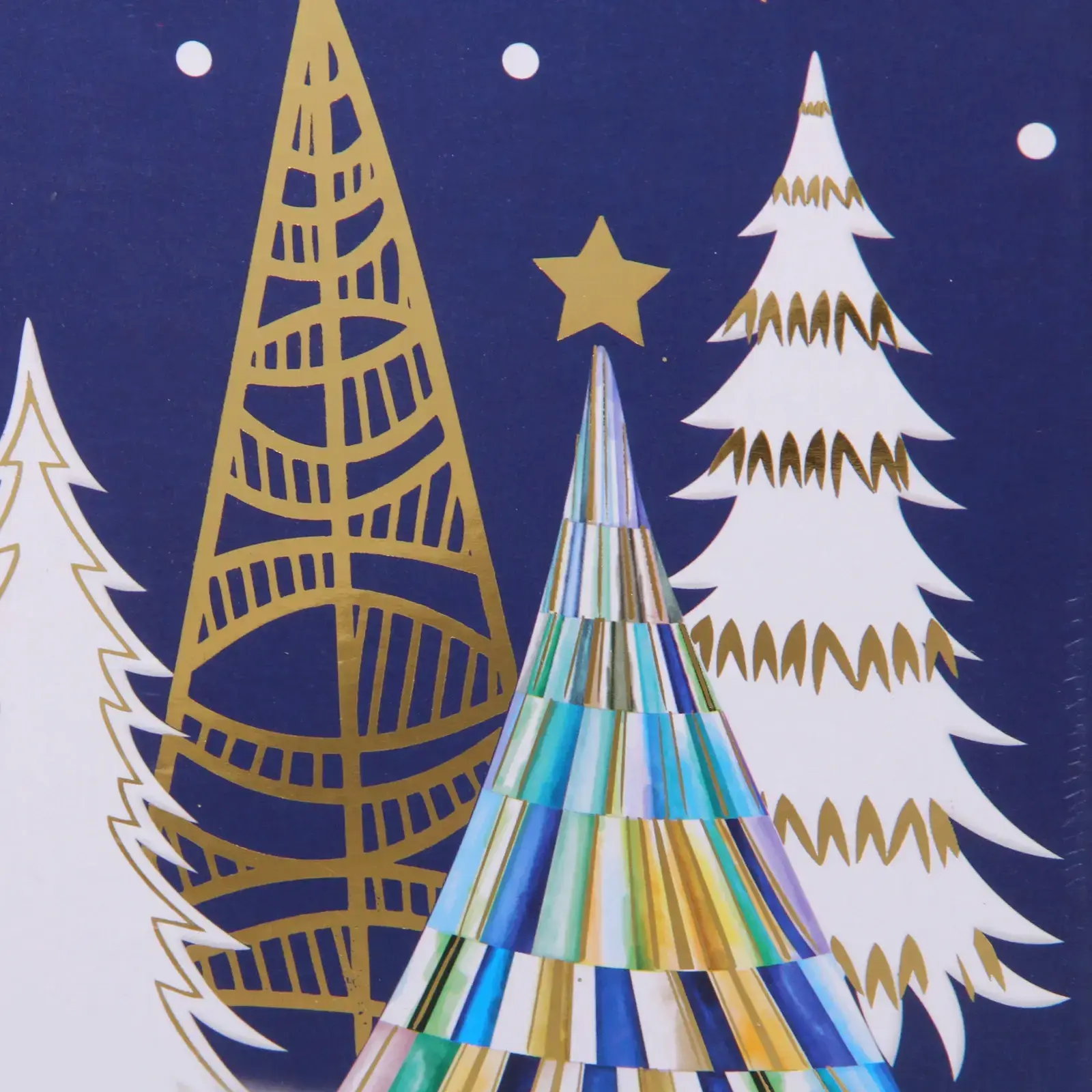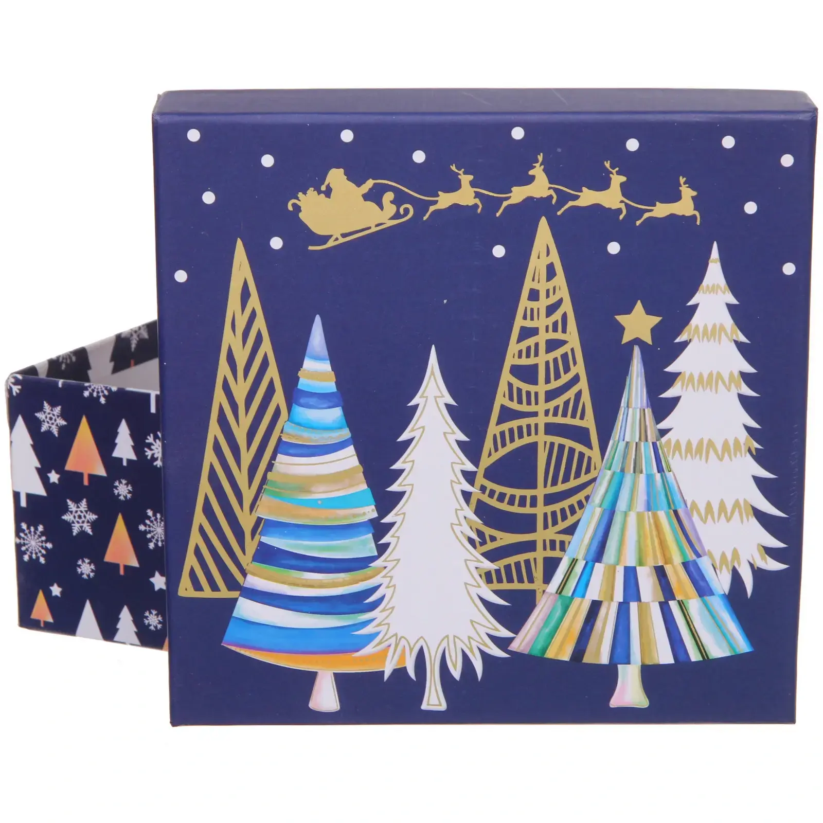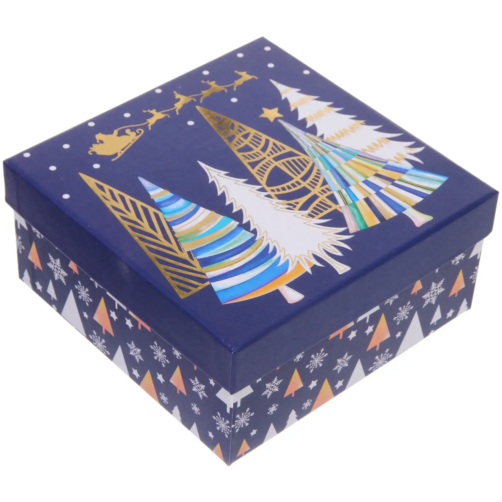 Коробка выполнена из качественного картона синего цвета с изящным новогодним дизайном. Декоративные элементы включают стилизованные ёлки, оленей и снежинки в золотых тонах.