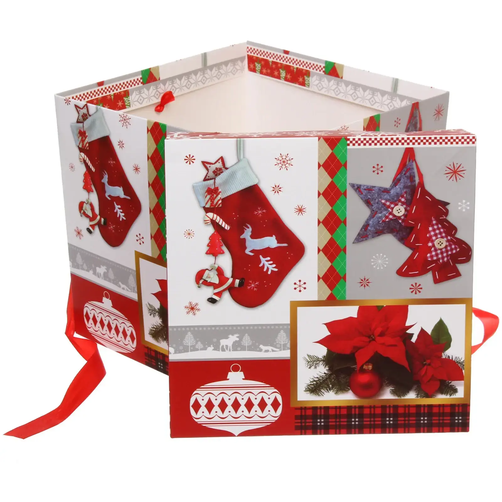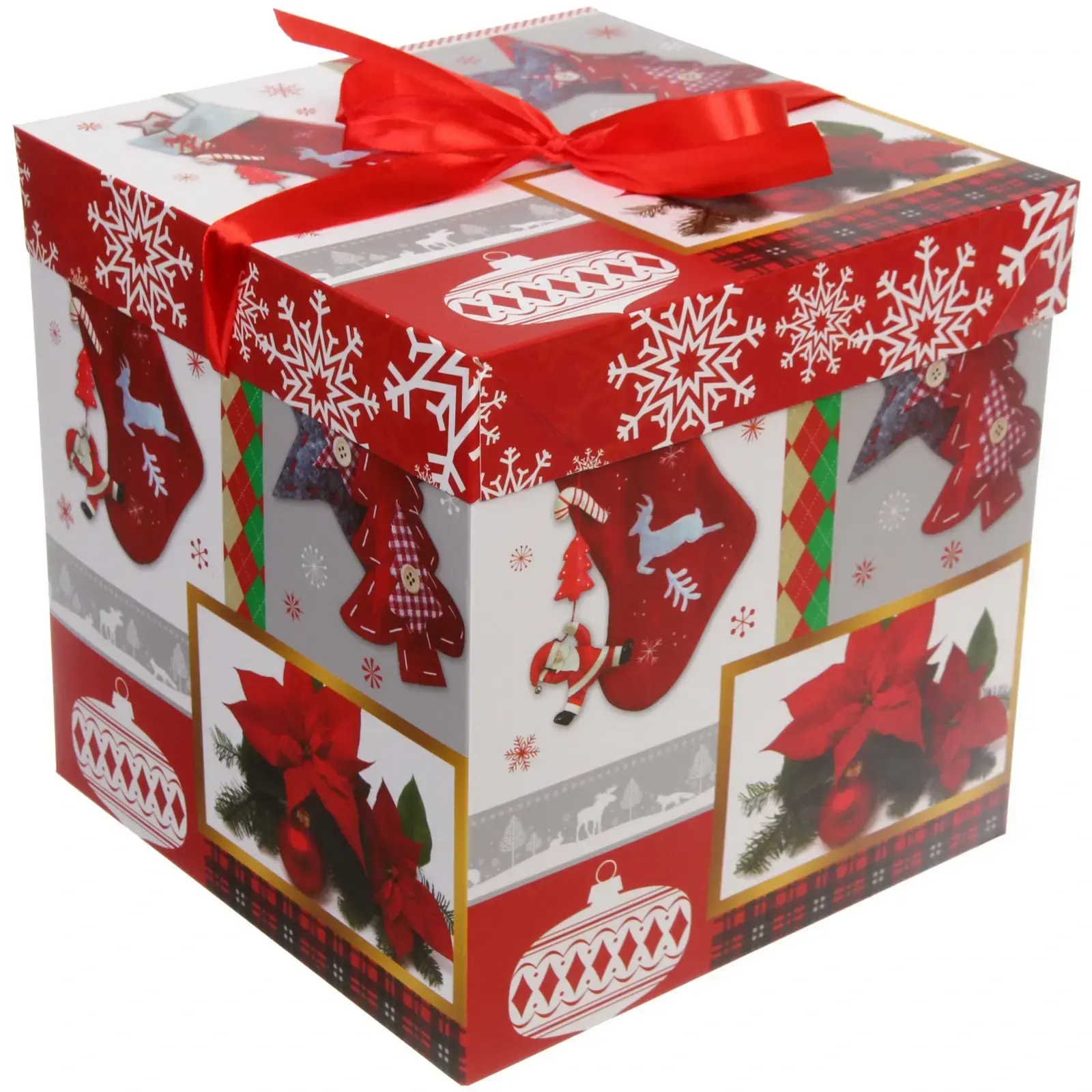 Коробка украшена праздничными элементами, такими как рождественские чулки и звезды, что делает её идеальной для новогодних праздников. Используйте её для упаковки подарков для друзей и близких, и создайте незабываемые моменты радости и счастья.