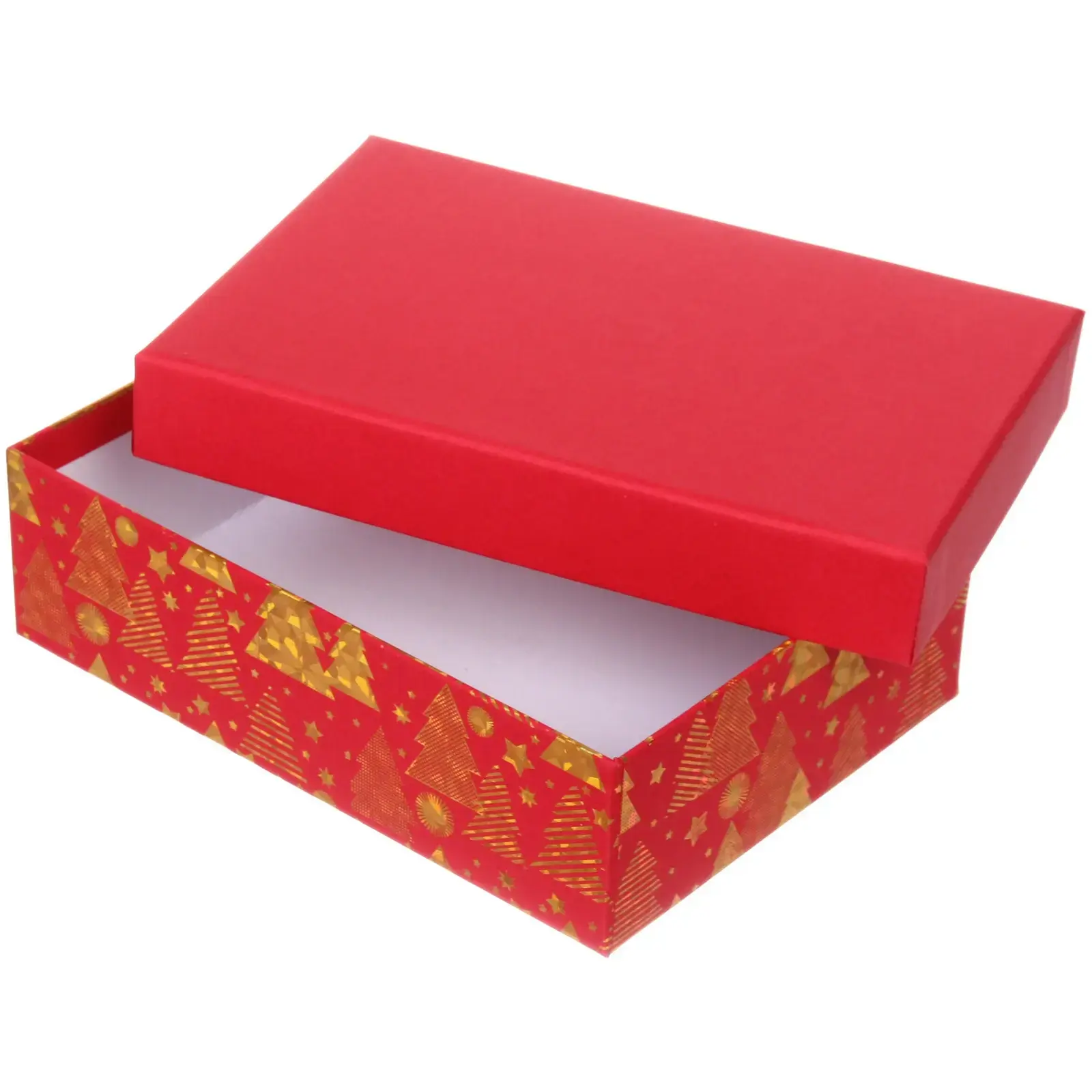 Коробка выполнена из прочного картона, что обеспечивает её долговечность и устойчивость к повреждениям. Красный цвет с золотыми узорами делает её идеальной для праздничных мероприятий. Внутренняя часть коробки белого цвета, что создает контраст и подчеркивает красоту внешнего оформления.