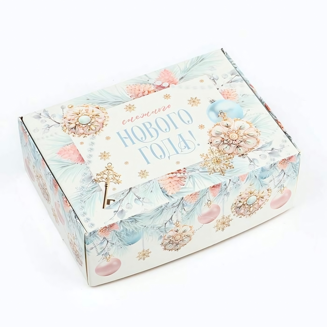 Светлый фон с золотыми и голубыми акцентами сочетается с классическими новогодними элементами: резными снежинками, елочными игрушками и веточками хвои. Красные детали добавляют динамики композиции, а золотой ключик на крышке символизирует волшебство праздника.