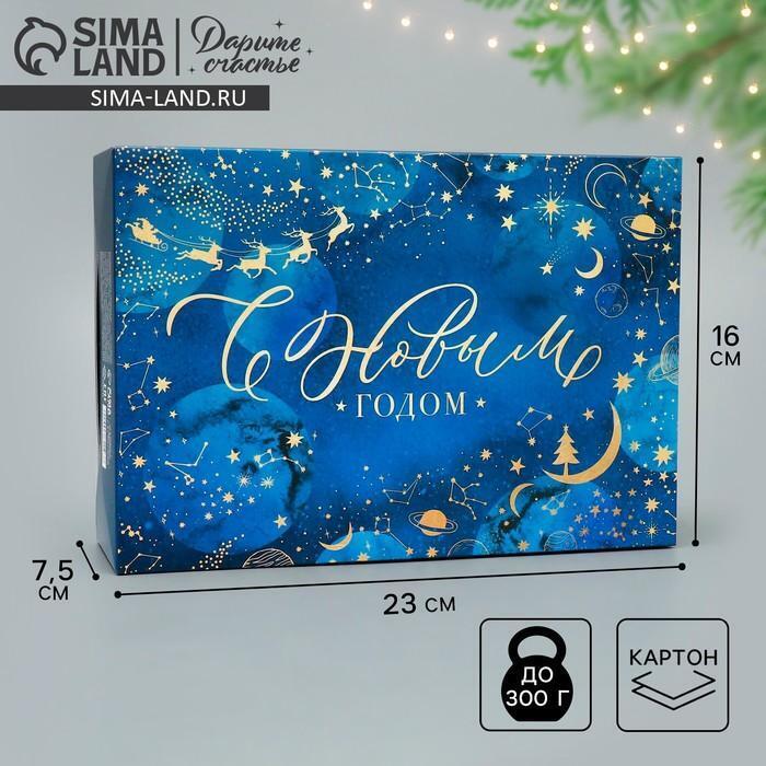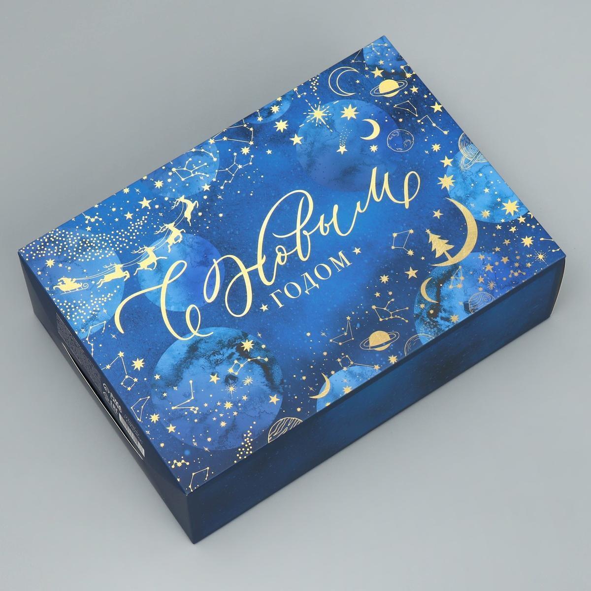 Размеры: 16×23×7.5см. Материал: плотный картон. Цветовое решение: темно-синий с золотыми акцентами, создающими эффект ночного неба с мерцающими звездами.