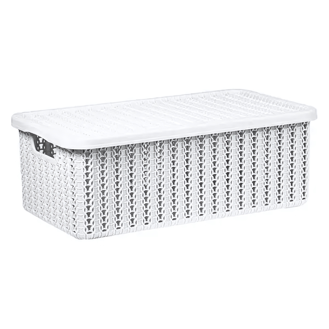 Корзина для хранения "ВЯЗАНИЕ" 6л с крышкой, пластик, белый, дизайн под ротанг, 12.5х19.5х35см