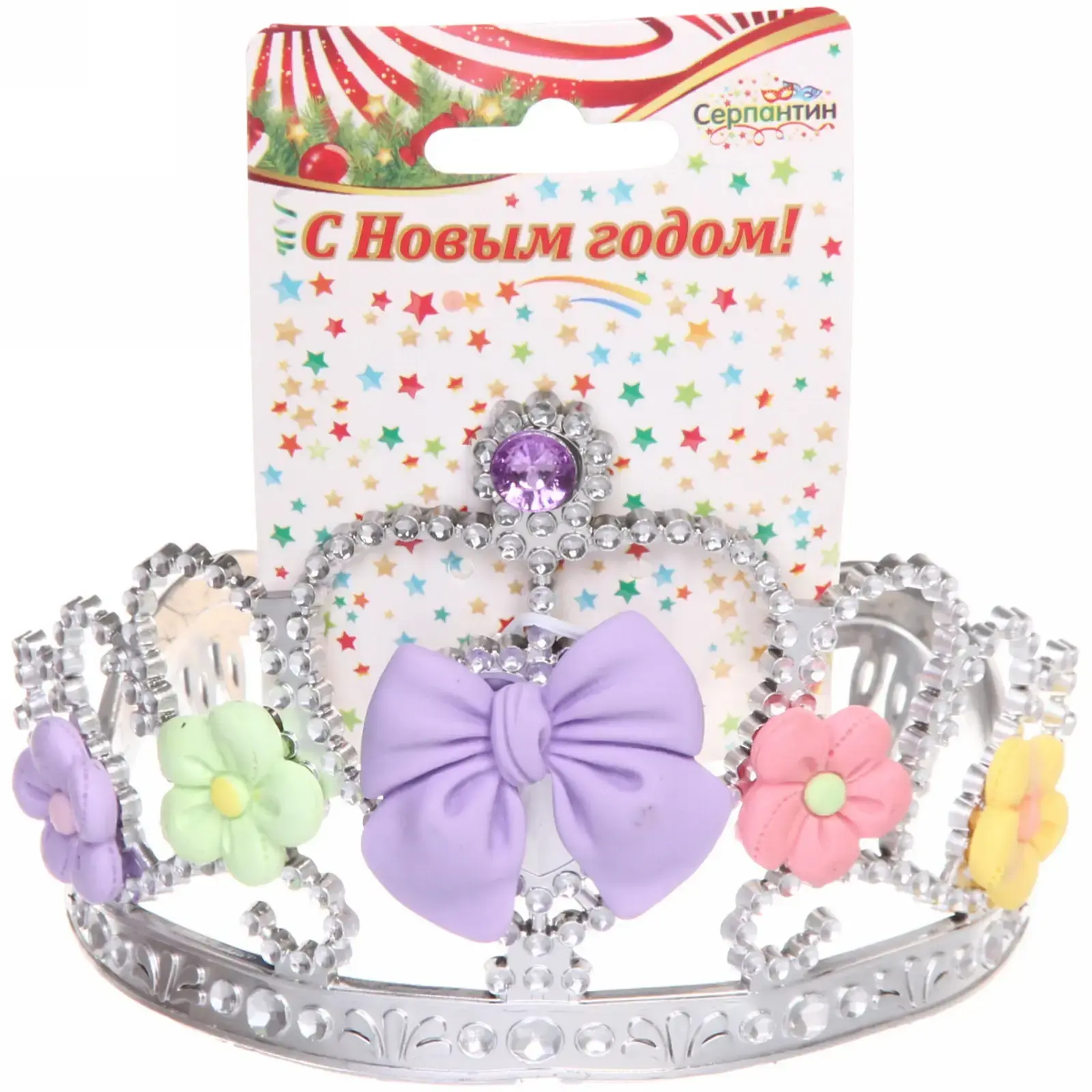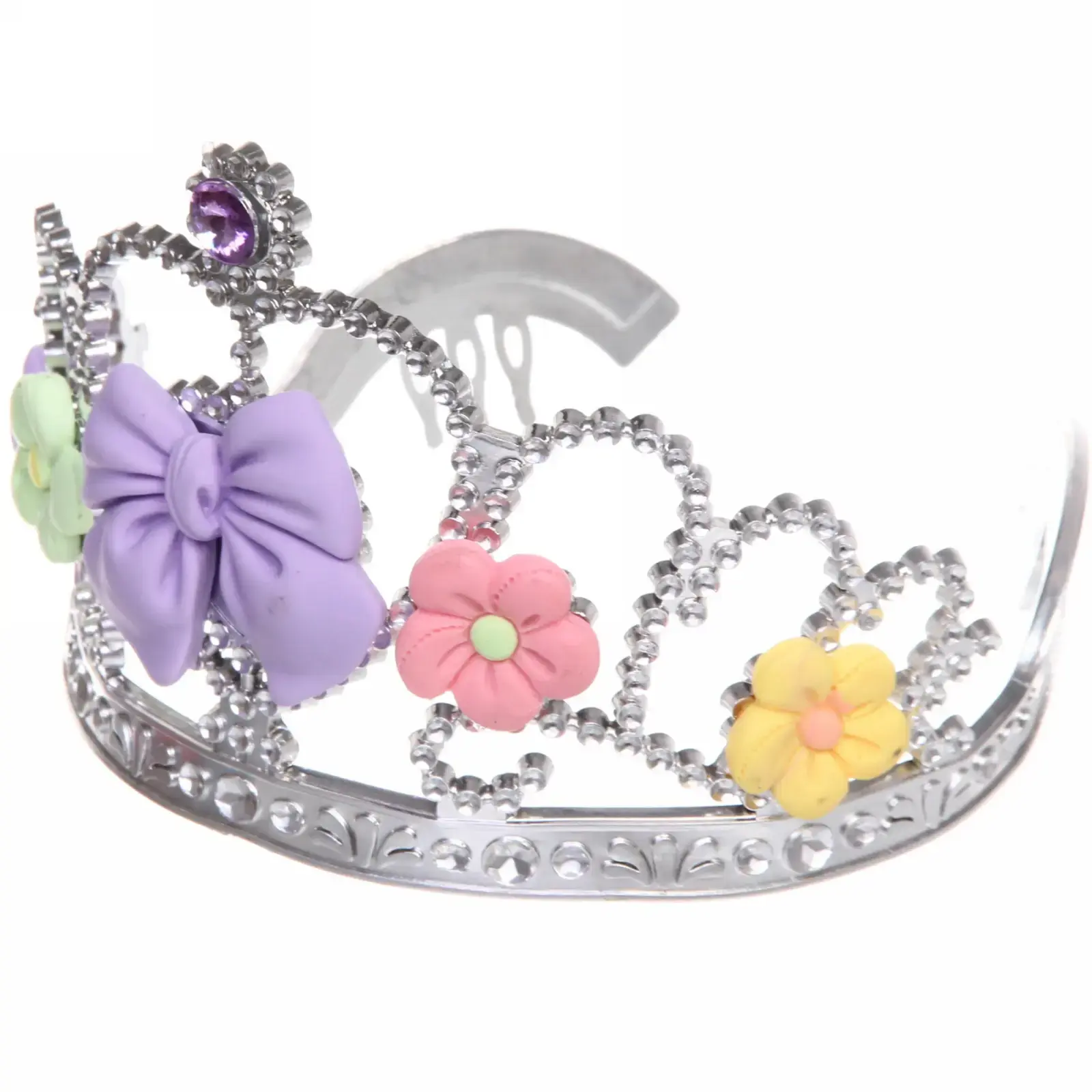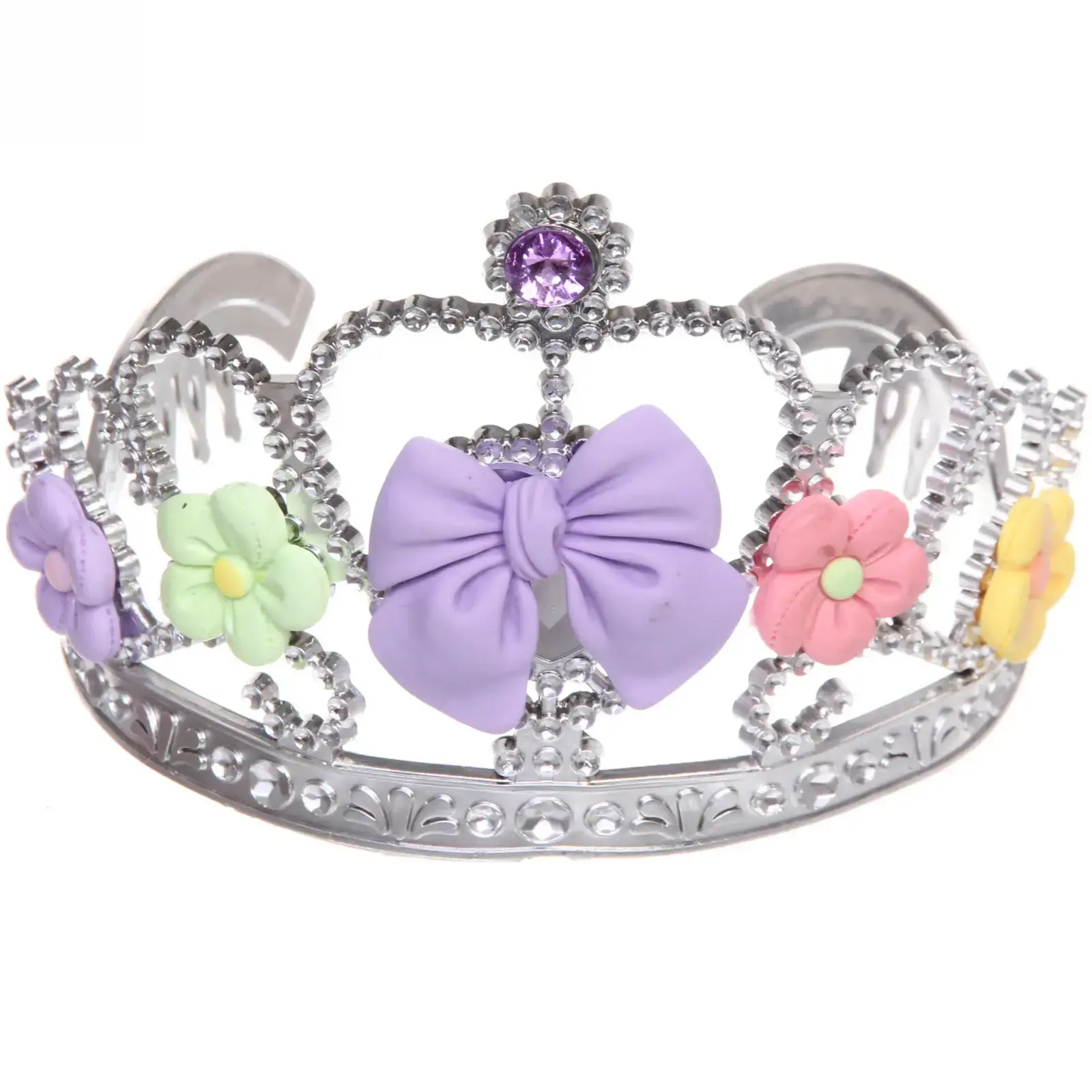 Эта корона выделяется своим уникальным дизайном: серебристый цвет с блестящей отделкой, украшенная цветами в пастельных тонах — фиолетовом, розовом, желтом и зеленом. В центре короны расположен фиолетовый камень, который добавляет дополнительный блеск и элегантность. Корона выполнена из прочного металла и пластика, что обеспечивает надежность и долговечность.