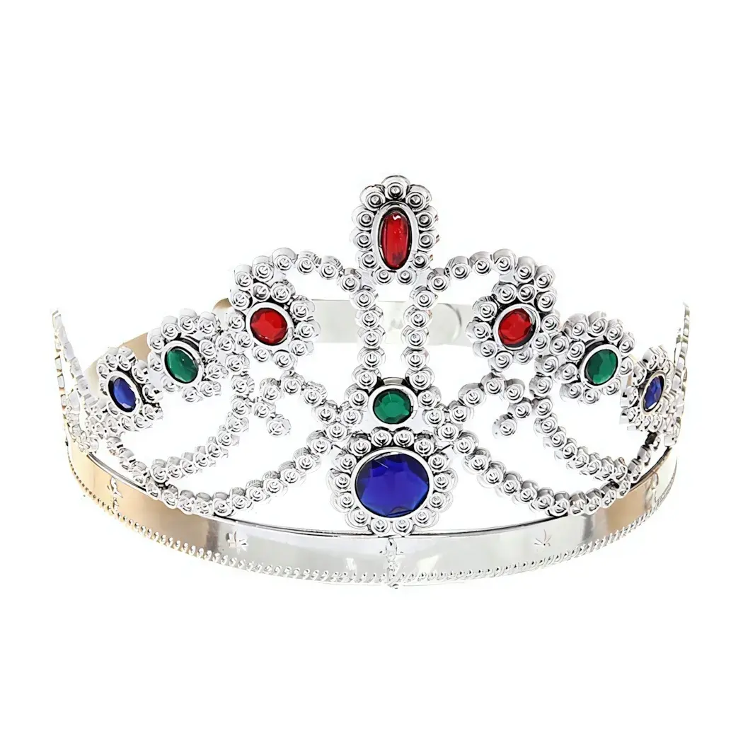 Корона выполнена из качественного серебристого металла и украшена яркими имитациями драгоценных камней: красными, зелеными и синими. Благодаря округлой форме и витковым узорам, она удобно сидит на голове и подходит для большинства размеров. Этот аксессуар станет отличным дополнением к любому костюму, придавая ему завершенность и элегантность.