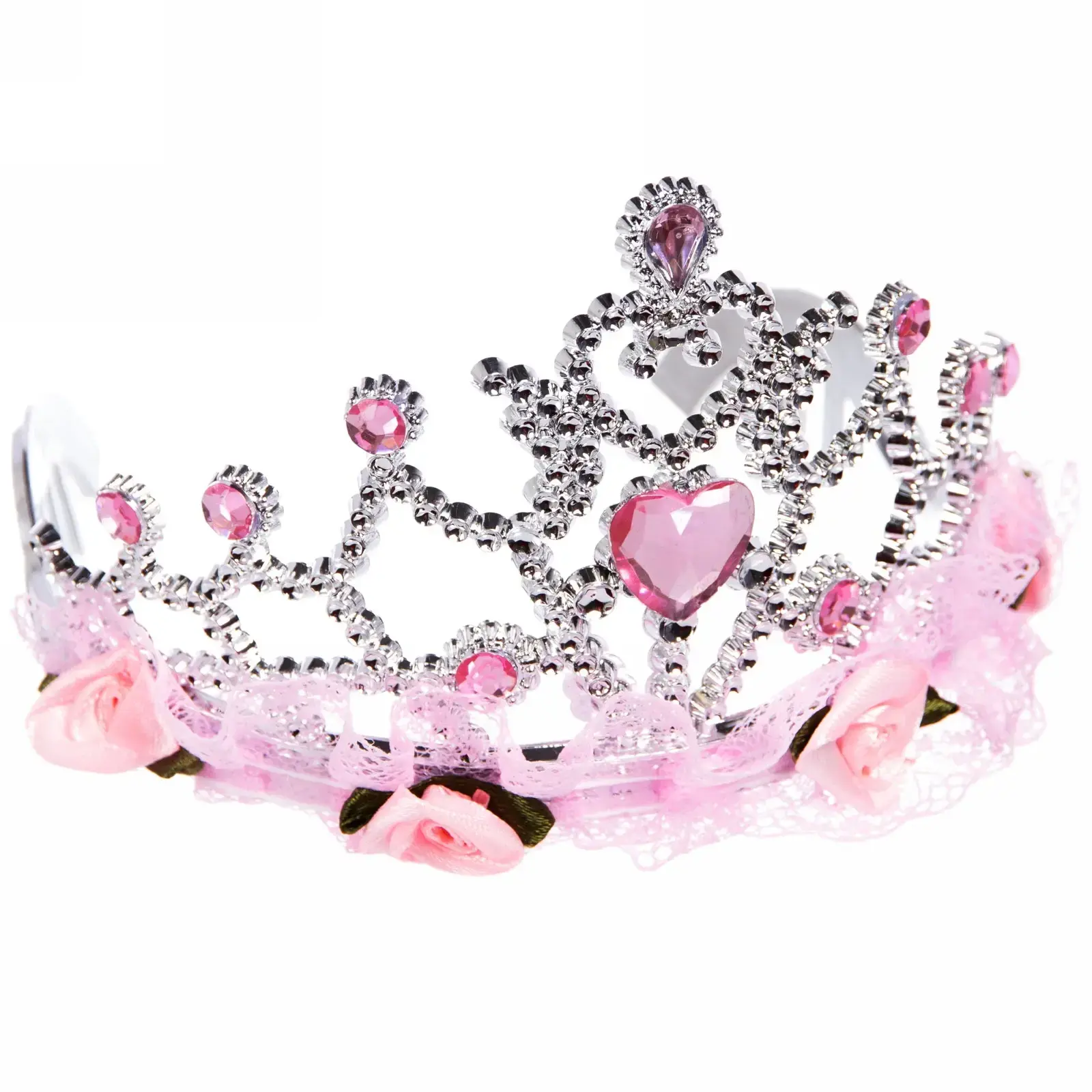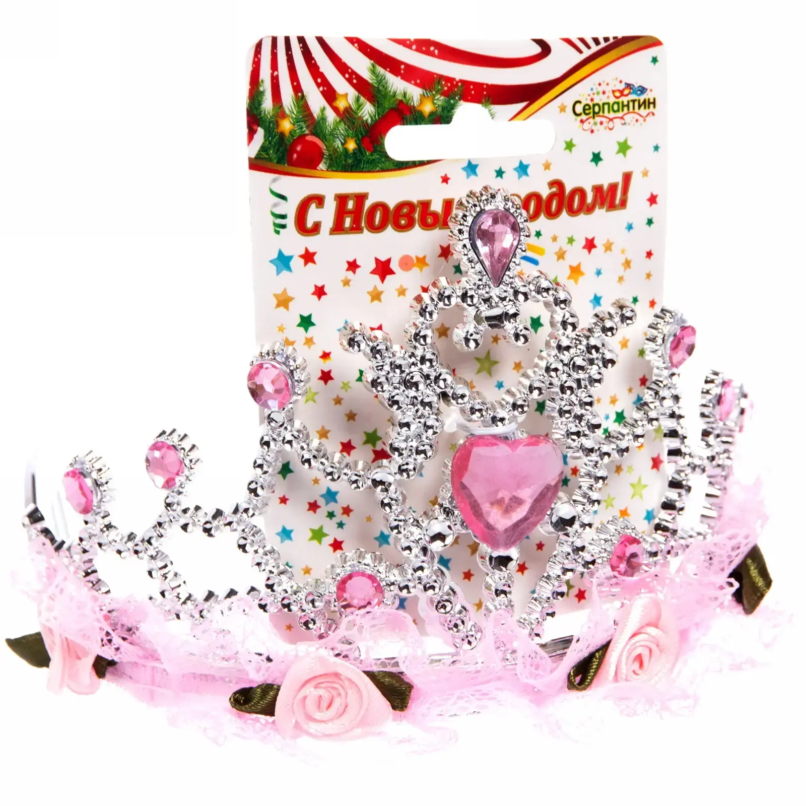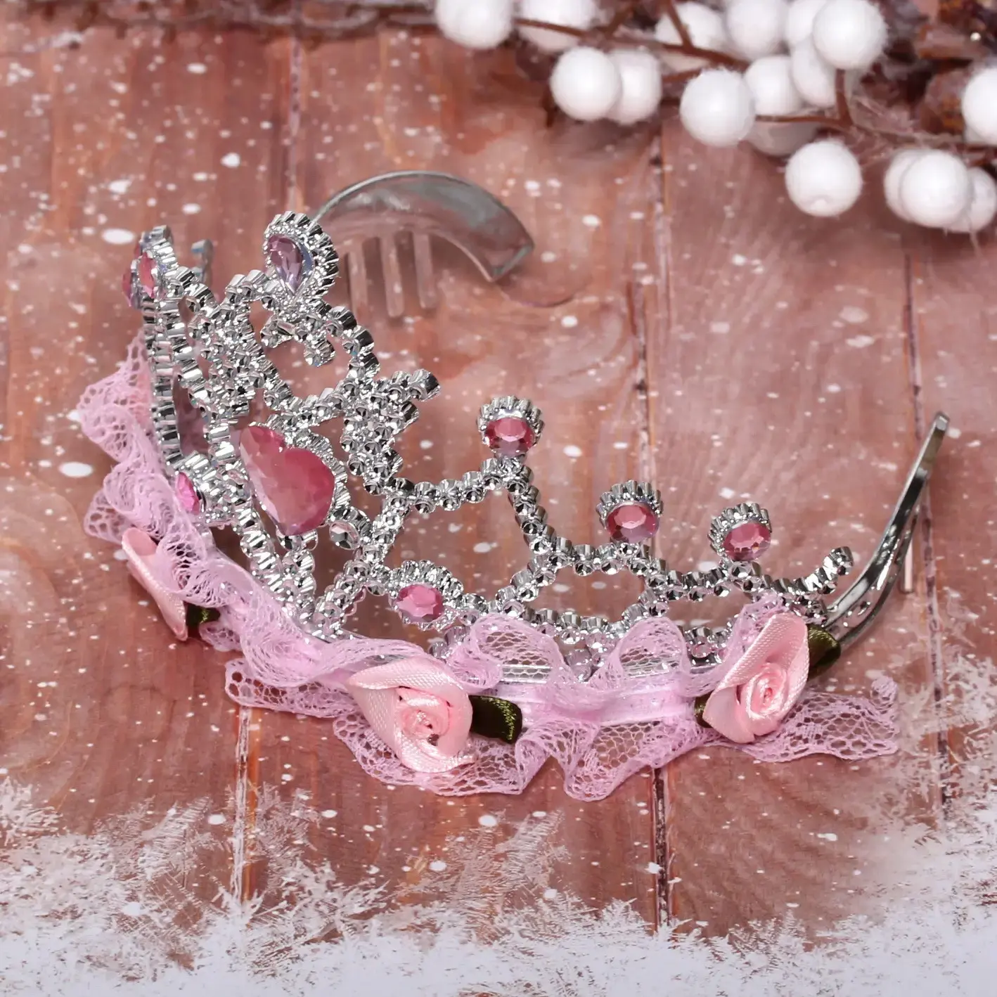 Корона изготовлена из прочного пластика, что делает её легкой и удобной в носке. Декоративные элементы включают крупные и мелкие камни, а также рюшечку из розового кружева, что добавляет изделию особый шарм. Размеры короны не указаны, но она визуально выглядит компактной и подходит для большинства голов.