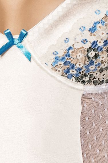 - Изысканный дизайн: Сочетание гладкой ткани с сатиновым блеском, нежного кружева с цветочным узором в бело-голубой гамме и декоративных атласных бантиков.
