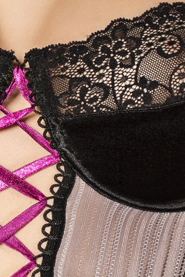 Корсет "Fabio" сочетает в себе классическую эстетику с современными деталями. Полупрозрачные вертикальные вставки по центру придают наряду игривость и загадочность, а контрастная шнуровка ярко-розового цвета (фуксия) создает эффектный акцент, приковывающий взгляд.