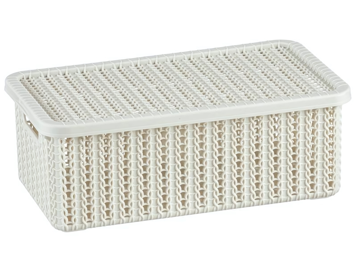 Этот изящный контейнер выполнен из прочного пластика и украшен имитацией вязания спицами, что создает уютную атмосферу в любом интерьере. Идеально подходит для хранения различных мелочей, белья, игрушек или кухонных принадлежностей, помогая поддерживать порядок и создавать приятную обстановку.