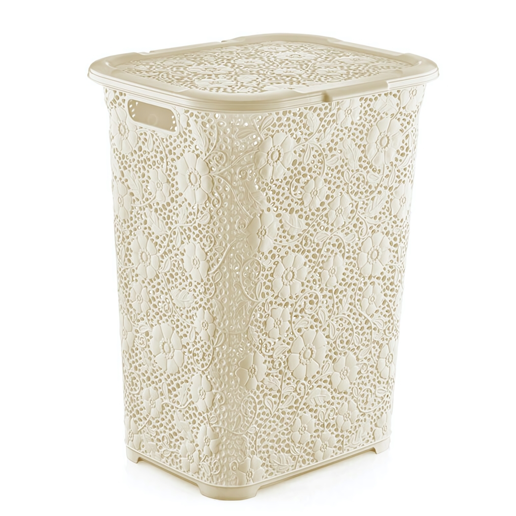 Корзина для белья 50л, ажурный дизайн, кремовый цвет, пластик, удобная ручка, закрывающая крышка