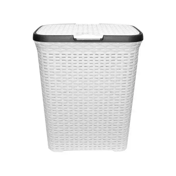 Корзина подходит для ванной, балкона или гардеробной. Прямоугольная форма с закругленными углами (примерные габариты 40×30×50 см) позволяет разместить ее в углу или под раковиной. Крышка с фиксатором плотно прилегает к корпусу — идеально для хранения детских вещей или сезонной одежды.