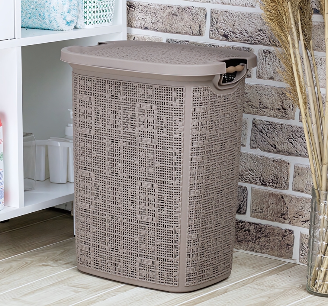 Корзина предназначена для сбора и переноса только что выстиранного белья. Она оснащена удобными ручками, имитирующими дерево, что позволяет легко поднимать и переносить её. Крышка корзины скрывает содержимое от посторонних глаз и может служить дополнительным местом для хранения легких туалетных принадлежностей. При открытии крышка фиксируется в вертикальном положении, что делает использование корзины ещё более удобным.