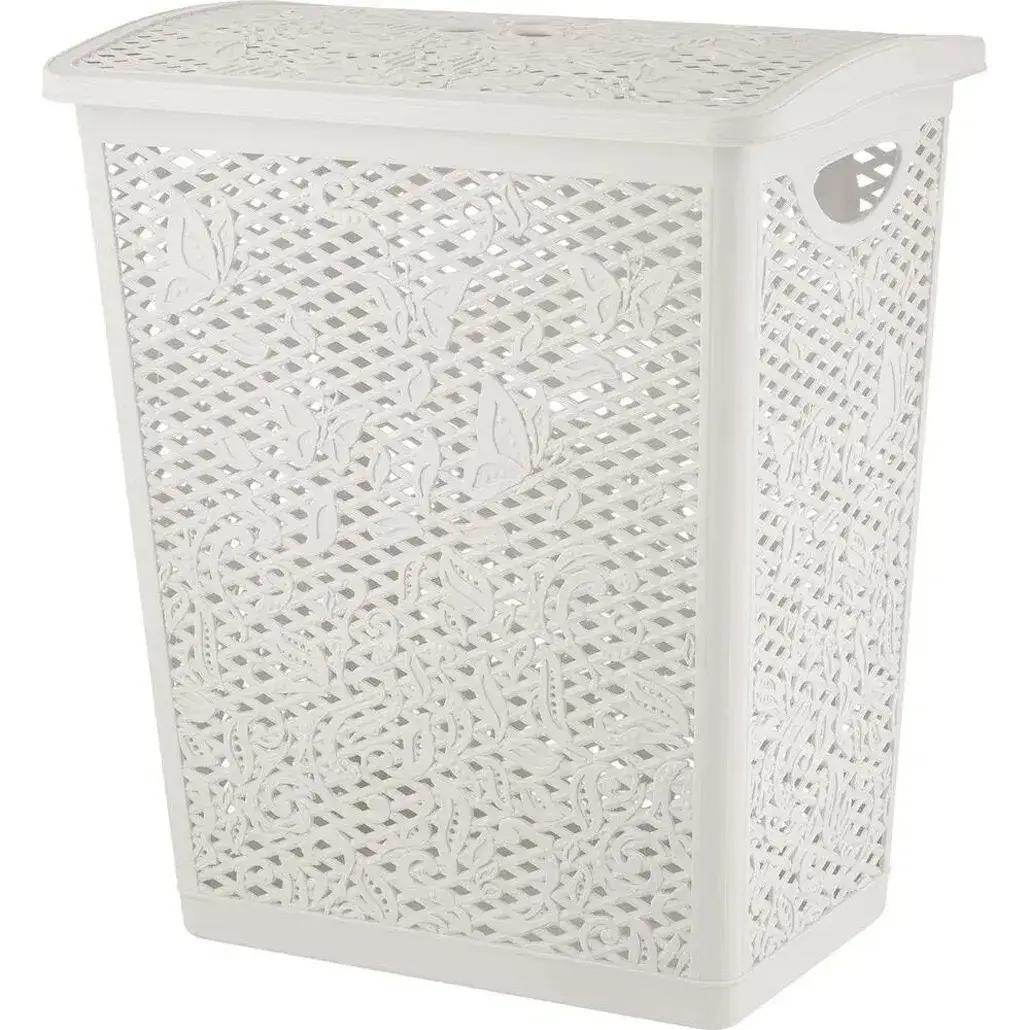 Изготовленная из прочного пластика с декоративным узором в виде бабочек и листьев, эта корзина обладает стильным внешним видом и практичностью. Съемная крышка помогает скрыть содержимое, а ручка на боковой стороне облегчает переноску.