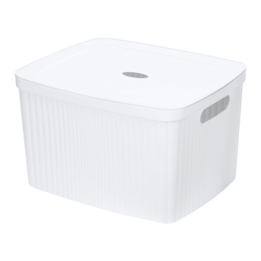 Корзина имеет объем 35 литров, что позволяет хранить большое количество вещей. Белый цвет и рифлёная текстура боковых стенок не только делают её привлекательной, но и улучшают захват при переноске. Крышка с круглым отверстием обеспечивает удобный доступ к содержимому, сохраняя при этом вещи в чистоте и порядке.