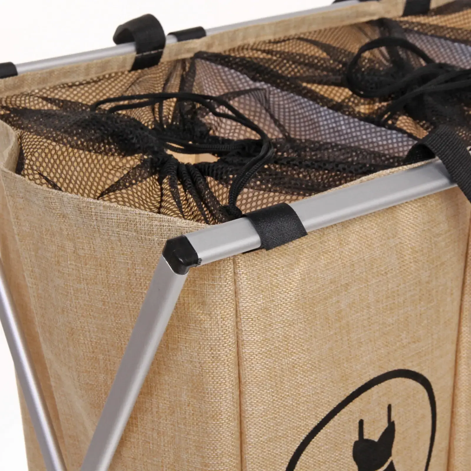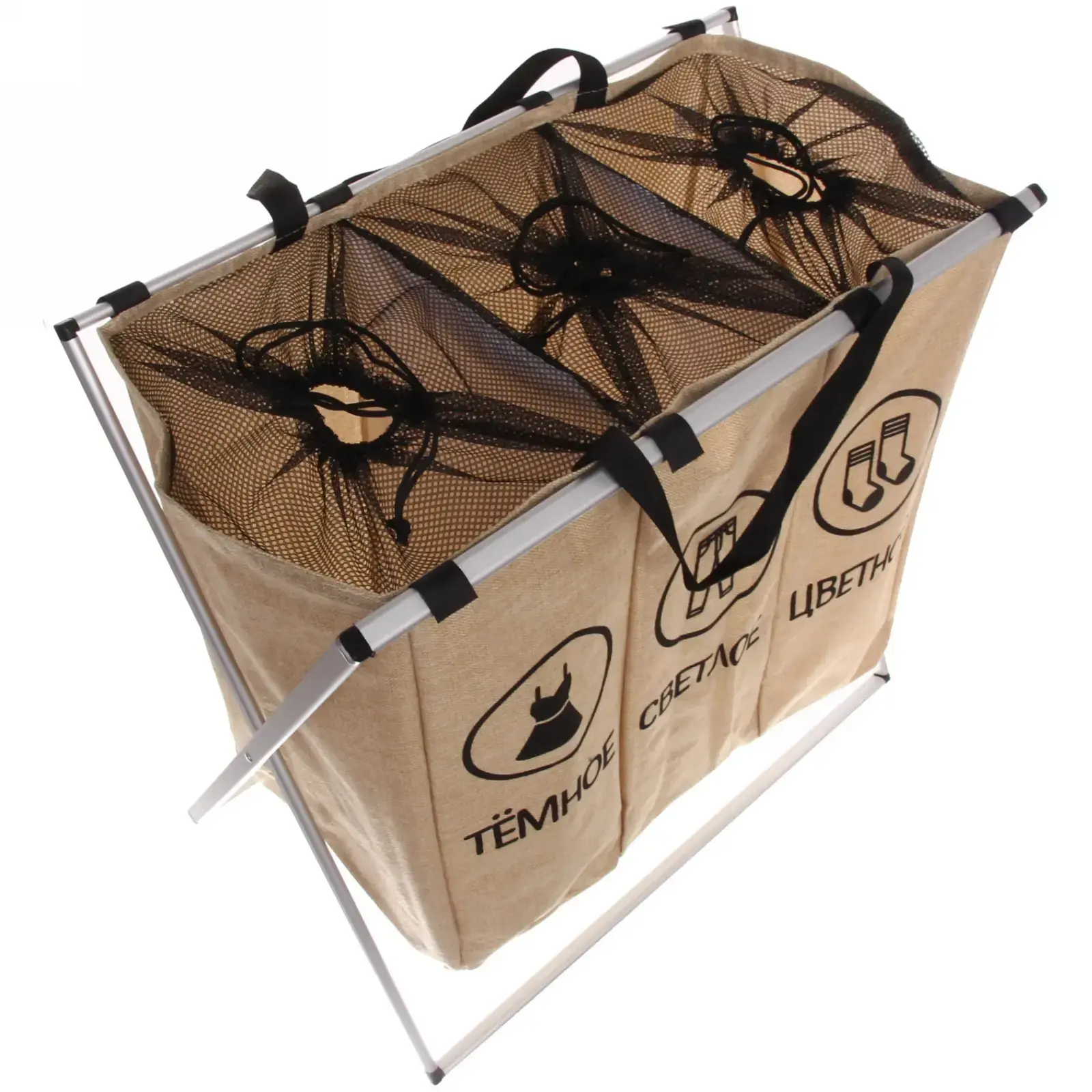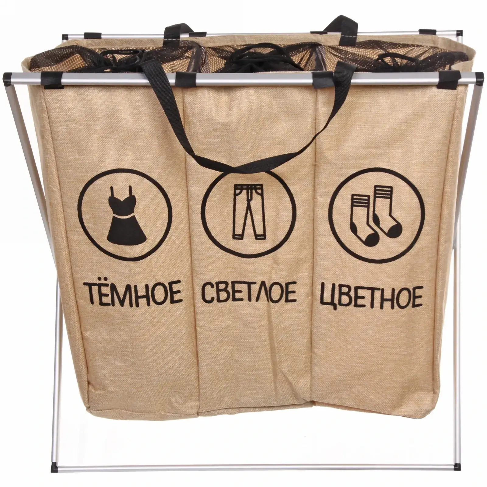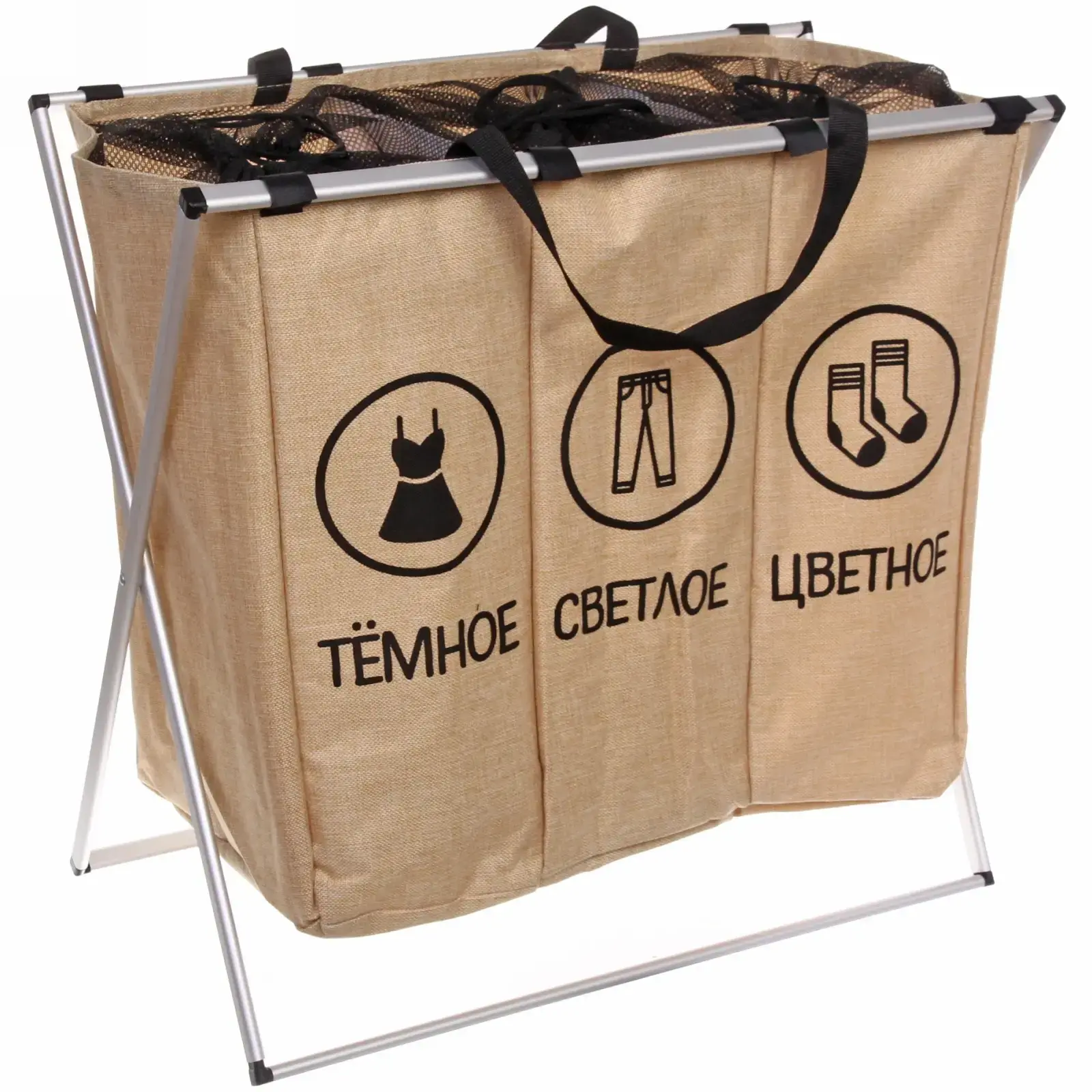 Корзина для белья тройная складная с секциями «Тёмное, Светлое, Цветное», 62×37×56,5 см, полиэстер, бежевая