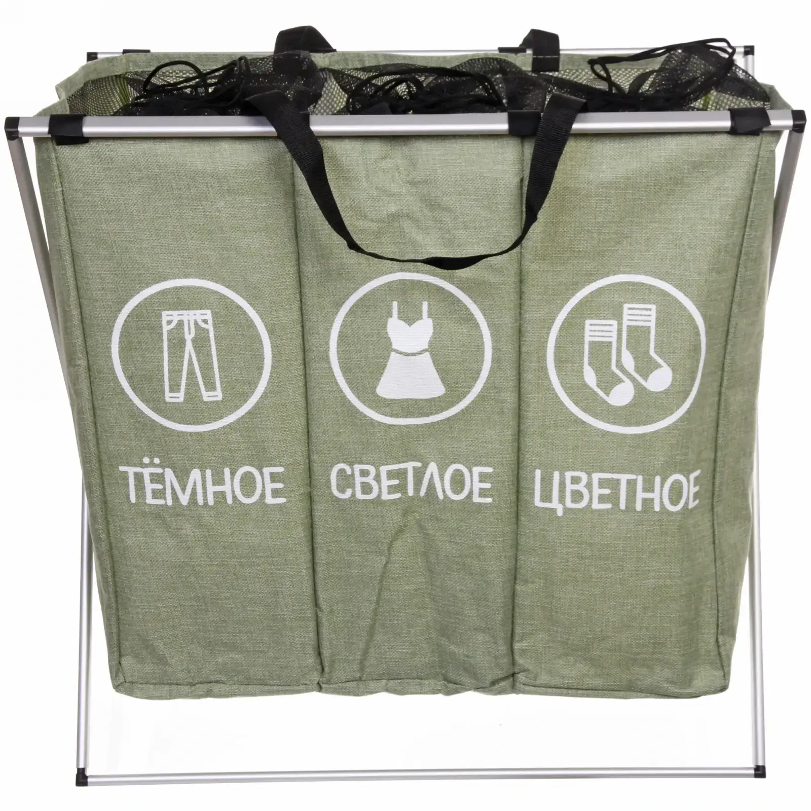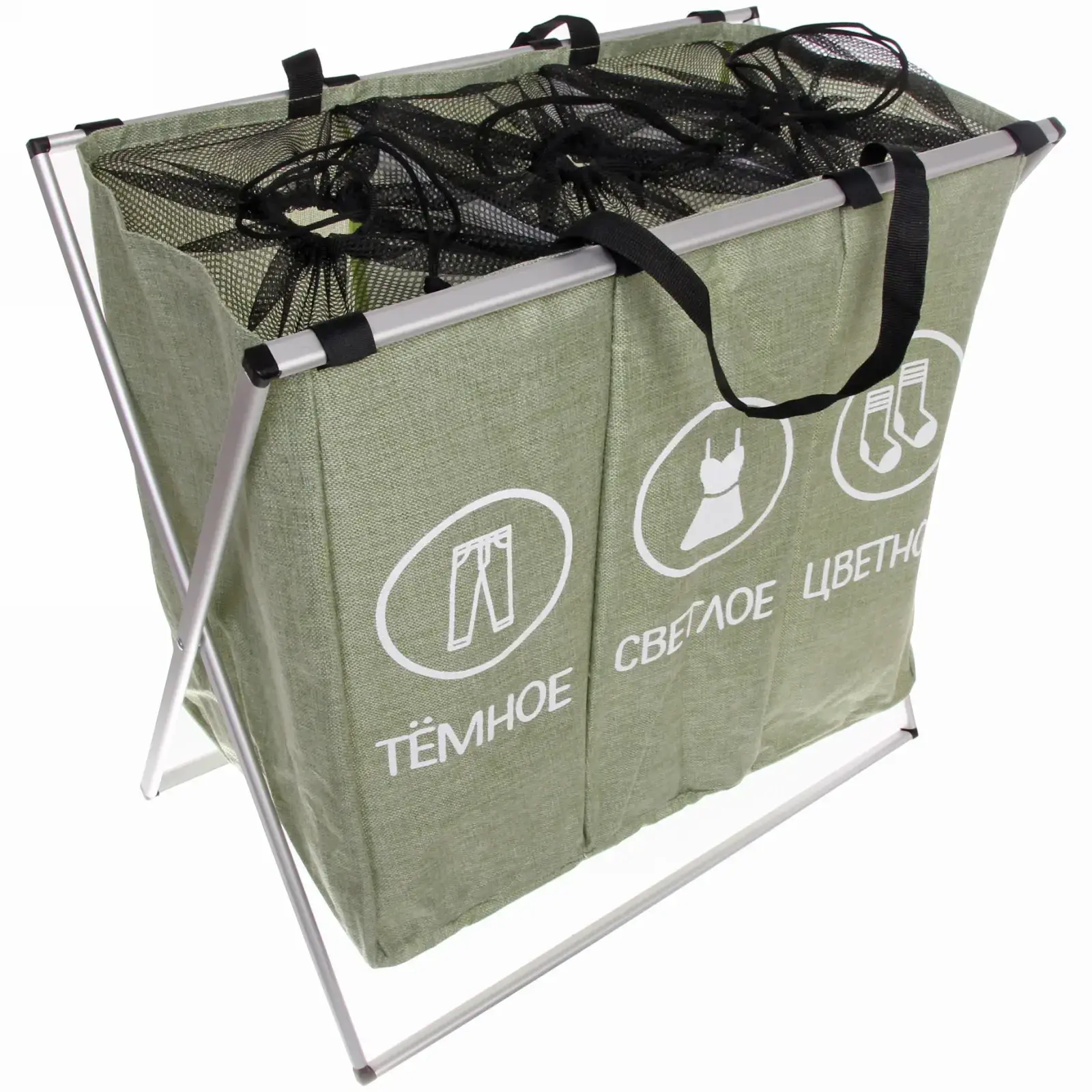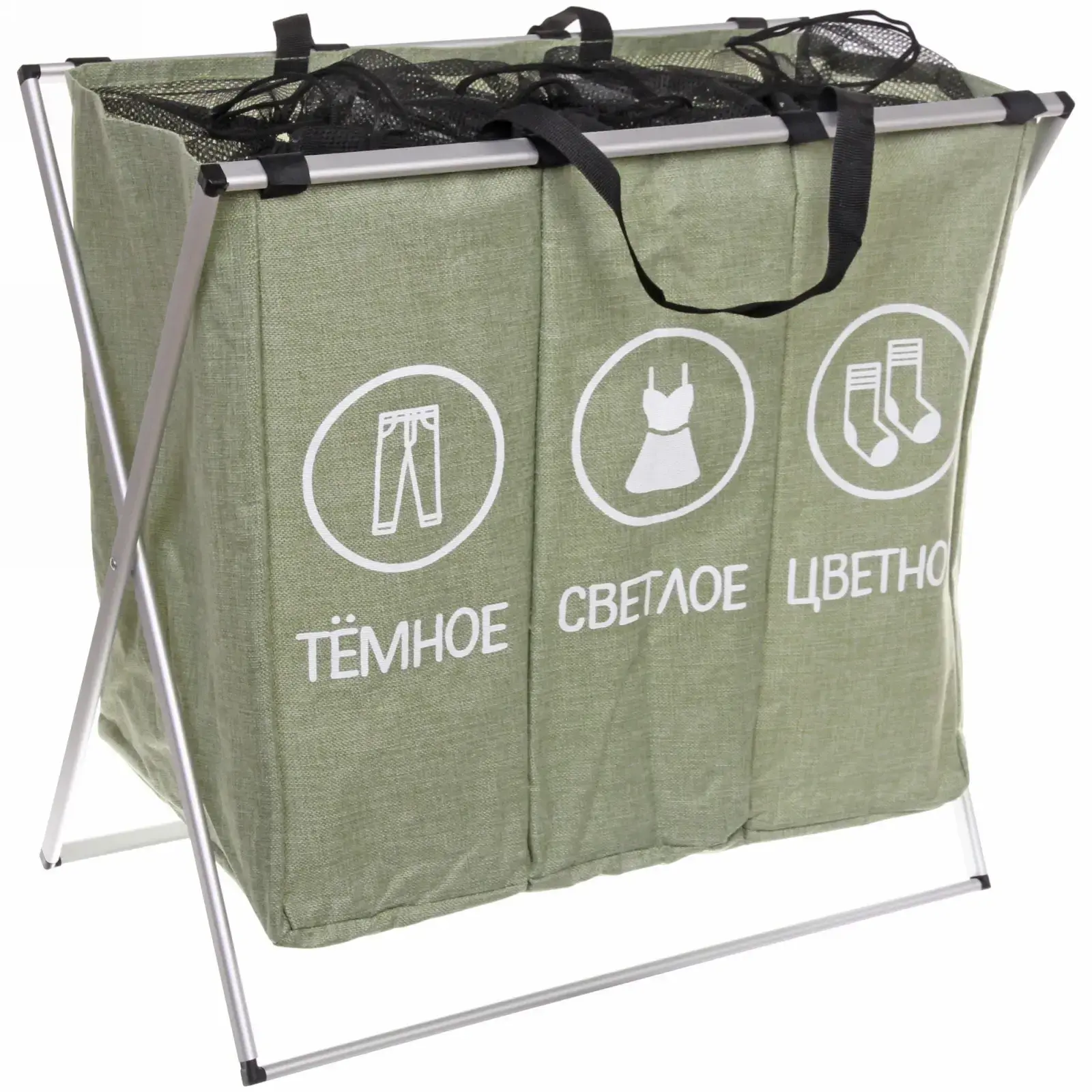 Корзина для белья тройная складная, 3 секции: тёмное, светлое, цветное, 62х37х56,5 см, полиэстер, зеленая