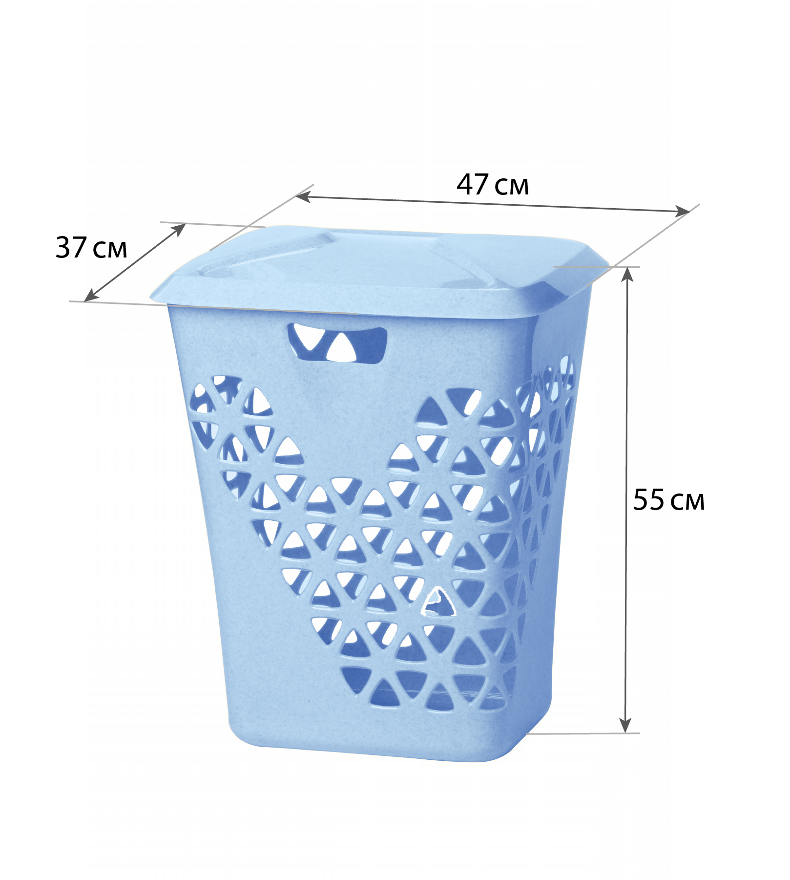 Корзина имеет объем 60 литров, что позволяет вместить большое количество белья. Размеры корзины составляют 47 см в длину, 37 см в ширину и 55 см в высоту. Это делает ее идеальной для использования в ванной комнате, где важно оптимально использовать пространство.