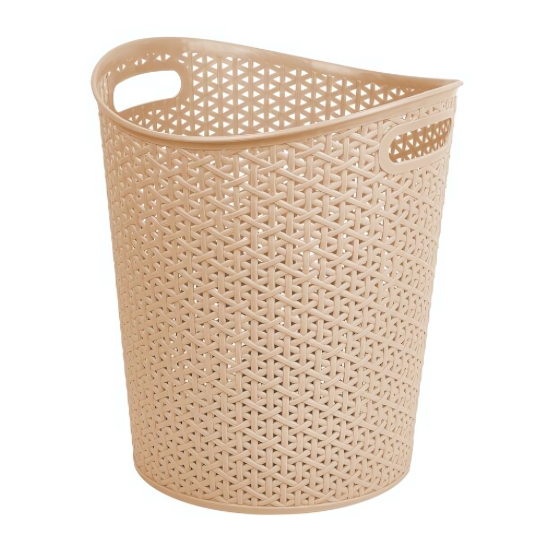 Корзина имеет овальную форму с низкой и широкой частью у основания, что делает ее удобной для использования. Хотя конкретные размеры не указаны, визуально она выглядит средней величины, что позволяет ей занимать минимальное пространство при максимальной функциональности.