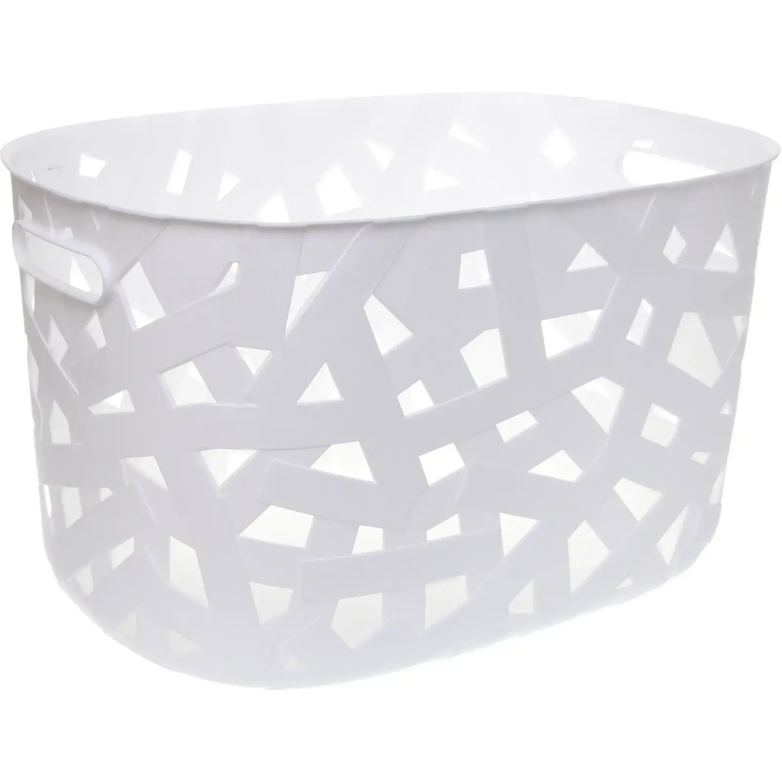 Корзина имеет удобные ручки, что делает её транспортировку простой и комфортной. Она идеально подходит для использования в детской комнате, ванной, на кухне или в прихожей. Благодаря своей овальной форме и перфорированному дизайну, корзина обеспечивает хорошую вентиляцию содержимого, что особенно важно для хранения текстиля или продуктов.