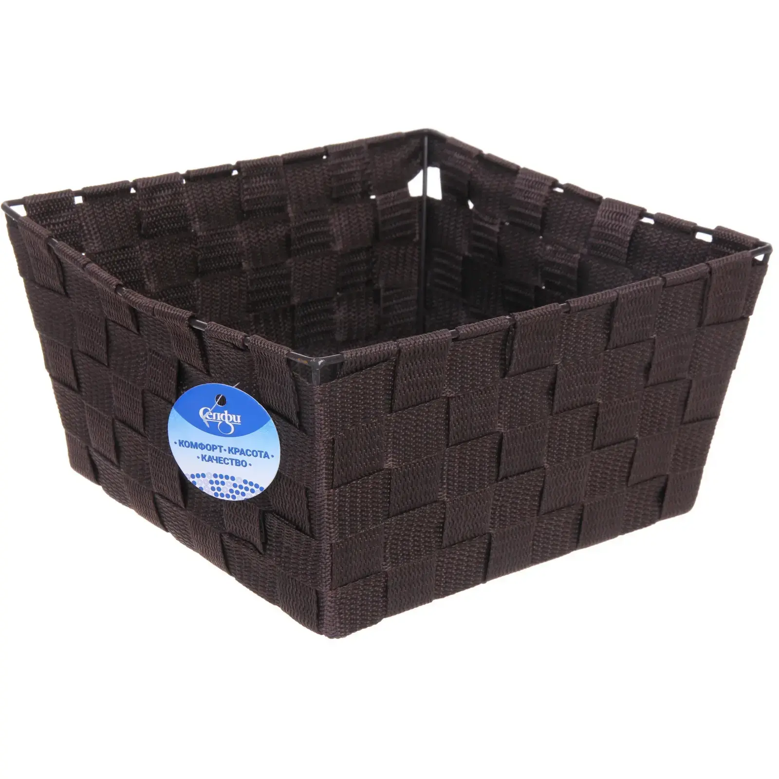 Размеры корзины: 25 см в длину, 25 см в ширину и 13 см в высоту. Материал: полиэстер и металл. Цвет: коричневый. Бренд: Селфи. Страна производителя: Китай.