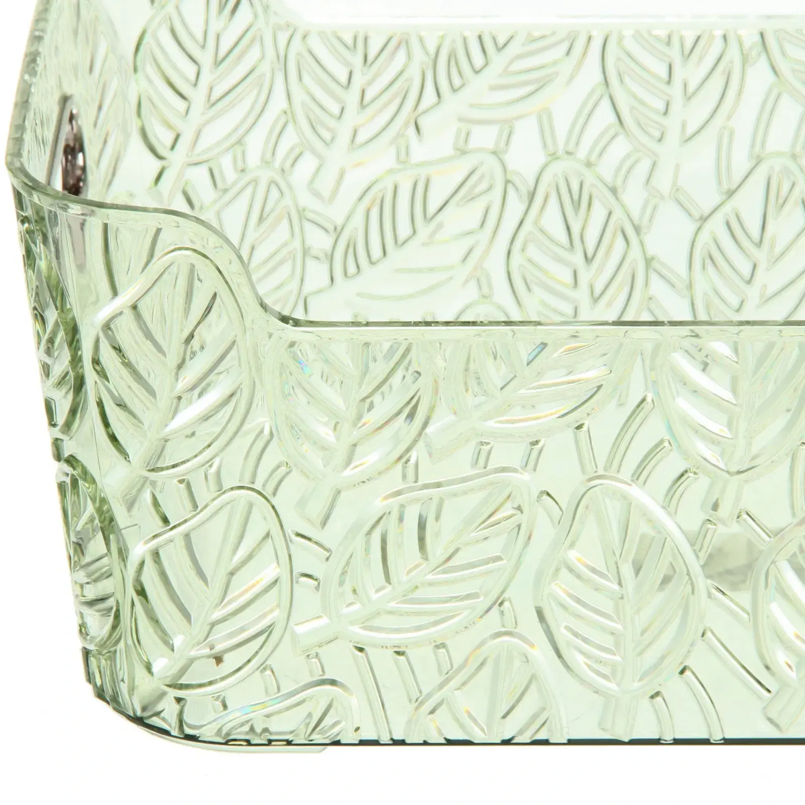 Корзина выполнена из качественного пластика, что обеспечивает ее долговечность и легкость. Прозрачные стенки позволяют видеть содержимое, а рельефный узор добавляет уникальности. Вы можете использовать ее как в домашних условиях, так и в офисе, что делает ее универсальным решением для хранения.