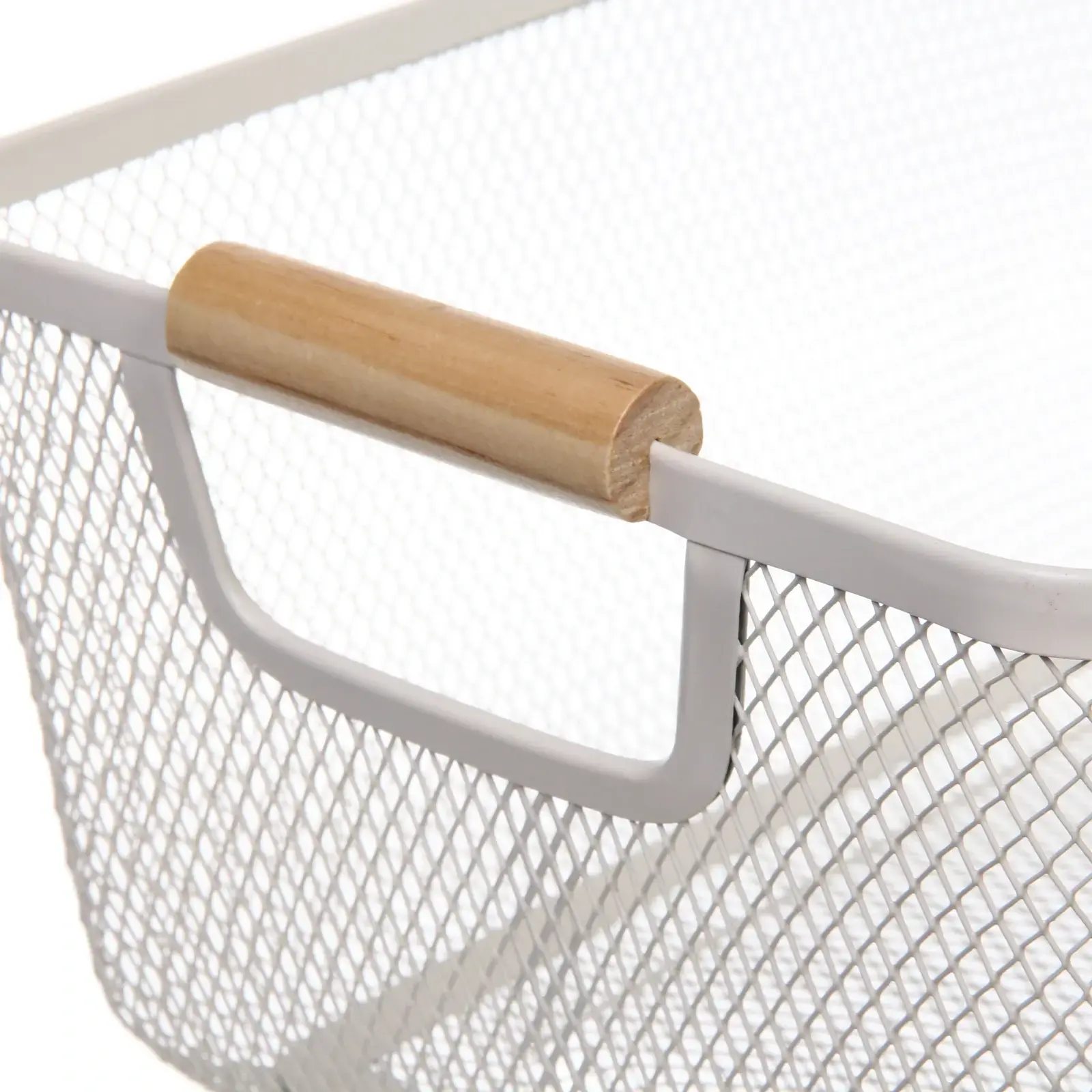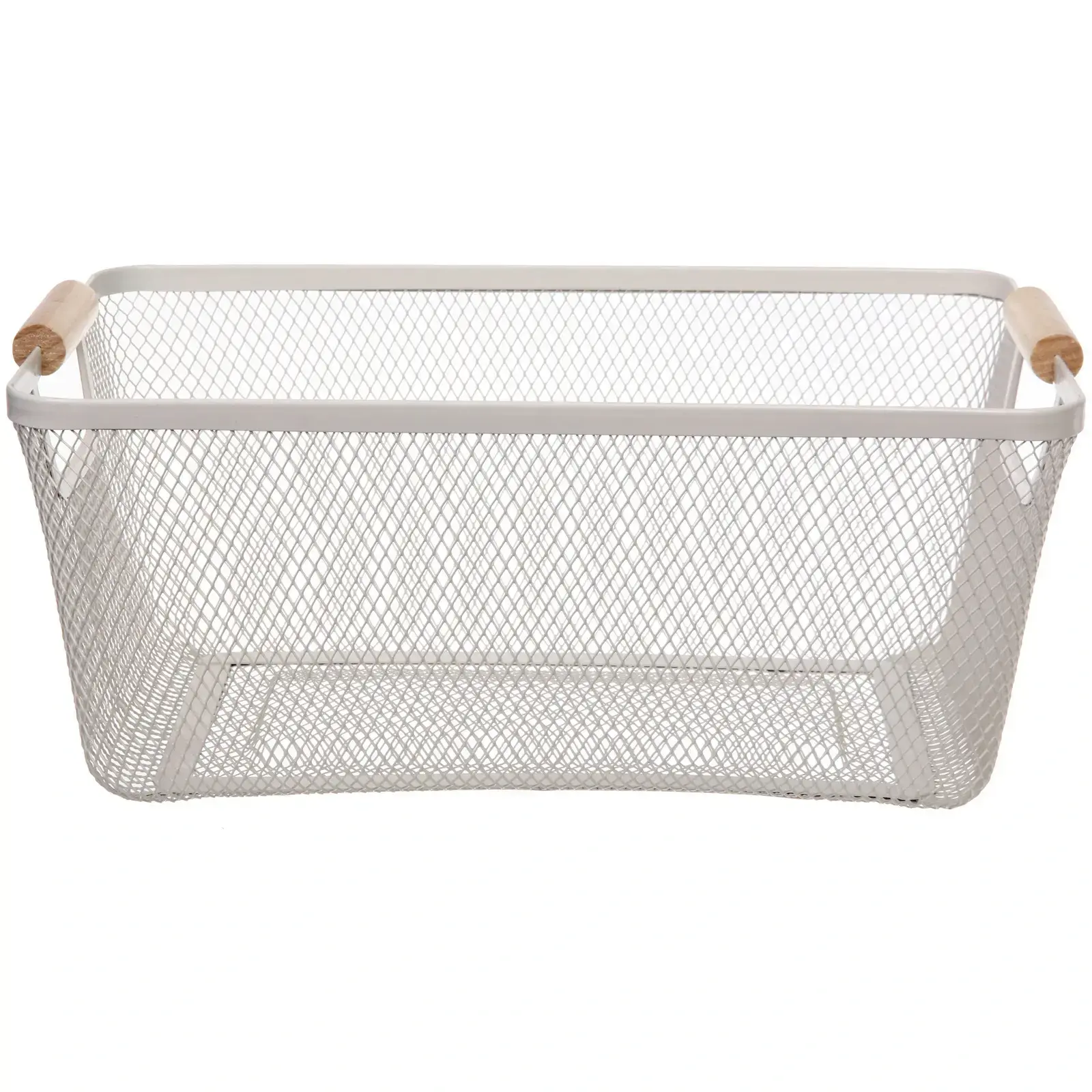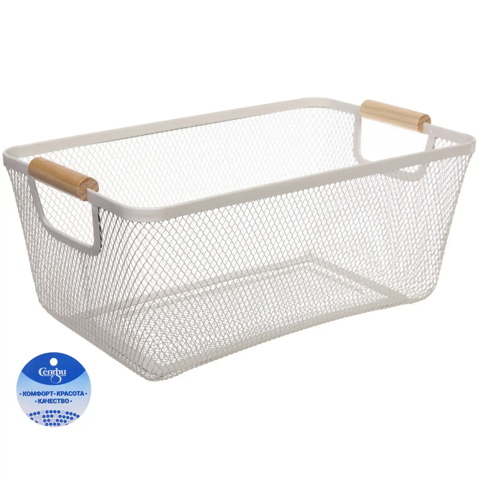 Эта стильная и функциональная корзина для хранения станет незаменимым помощником в организации пространства. Благодаря своему современному дизайну и качественным материалам, она не только украсит ваш интерьер, но и обеспечит удобство в использовании. Корзина выполнена из прочного металлического материала с сетчатой структурой, что позволяет видеть содержимое и обеспечивает хорошую вентиляцию. Деревянные ручки добавляют ей элегантности и удобства при переноске.